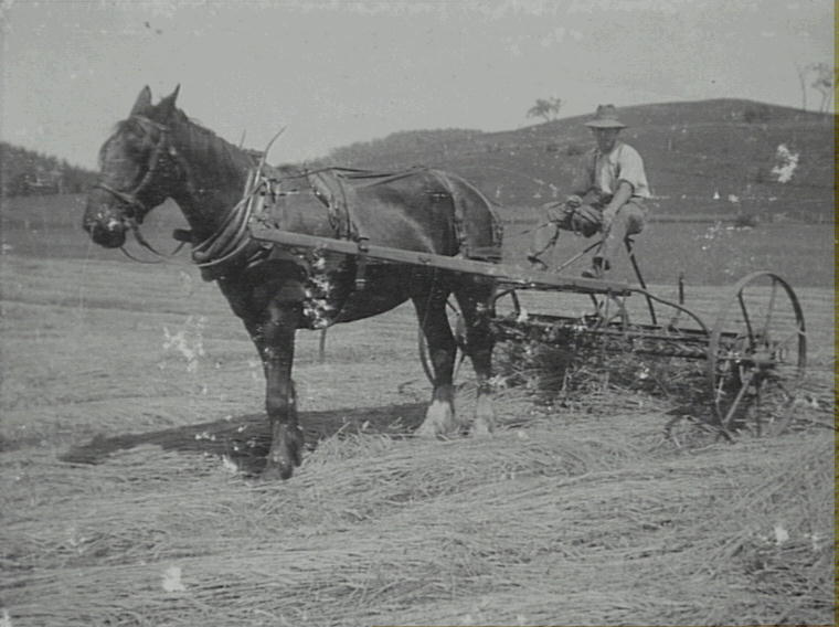 A 1917 view of Harold Perkin’s father on a horse-drawn rake at Cawdor. Horses were commonly used on farms throughout the Camden District until after the Second World War. The growing of hay for stock feed was one of the more popular crops grown on local farms. It was sold on the Sydney market to stables to feed horses that were used around the city for deliveries and other activities. In this image, the grass is cut and being raked into rows to dry. It will then be bailed up for sale or made into a haystack on the Perkin’s dairy farm, which would be used later as stock feed.