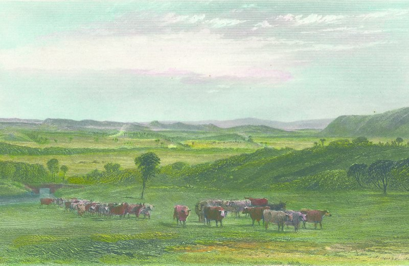 The county of Camden contains the extensive tracts known by the name of the Cow Pasture, which which five of the cattle that were landed from His Majesty’s ship Sirius, soon after the first arrival of Governor Phillip, had strayed from their place of confinement. They were discovered in these tracts in the year 1795 by a convict, and appear to have been attracted to the spot, and to have continued there, from the superior quality of the herbage. Since that period their numbers have greatly increased: and they have latterly occupied the hilly ranges by which the Cow Pastures are backed on the south, and have been found in the deeper ravines of the hills of Nattai, and on the banks of the Bargo River. It does not appear, however, that they have penetrated beyond the Blue Mountains, or the barren tract that is called the Bargo Brush. The Cow Pastures extend northwards from the river Bargo to the junction of the river Warragumba and the Nepean. To the west they are bounded by some of the branches of the latter river and the hills of Nattai. They contain by computation about sixty thousand acres; and the soil, through varying in fertility, but always deepening and improving on the banks and margin of the Nepean, consists of a light sandy loam, resting upon a substratum of clay.