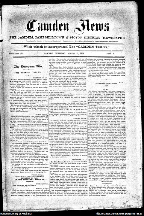 In September 1914, the Camden News published a series of six articles written by William Sidman. They documented his personal experiences of the chaotic events of Paris at the outbreak of the Franco-Prussian war in 1870. (Camden News, 27 August, 3 Sept, 10 Sept 1914, 17 Sept, 24 Sept, 1 Oct 1914)