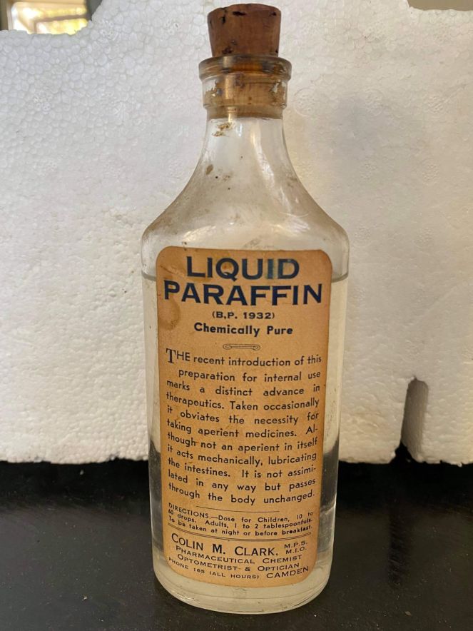 My interest in the Clarks was partly prompted by a photograph of a bottle of liquid paraffin sent to me by local resident Nicole Comerford. Colin had dispensed the paraffin to Nicole’s grandmother, Sheila Murdoch of Orangeville.