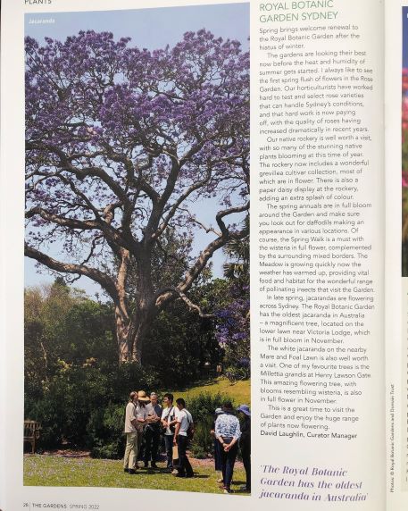 Going back further, the first mention of Jacarandas was from Camden’s Ferguson’s Australian Nurseries in 1876 in Melbourne’s Australasian newspaper.