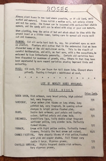 Roses were a speciality and included novelty roses for 1957, standard roses and others. The catalogue advised gardeners to achieve the best results with roses, particularly with planting and pruning. (Ferguson Nursery 1957)