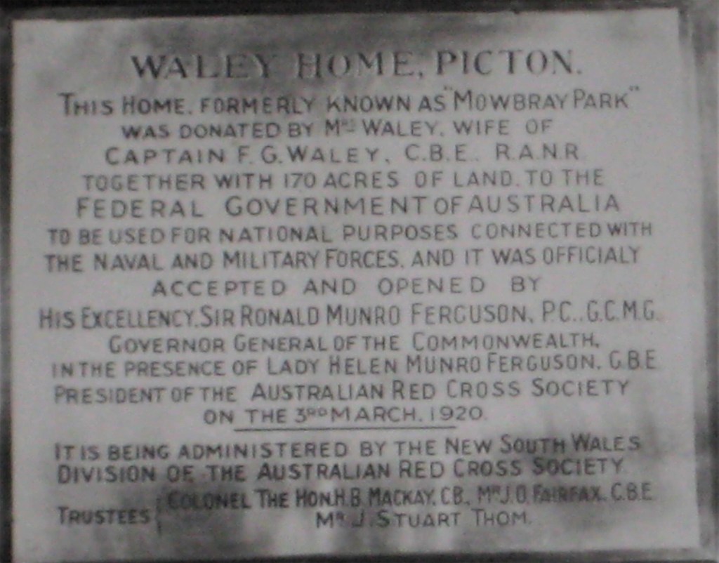 In 1919 Mowbray Park, five kilometres west of Picton, was handed over to the Commonwealth Government to be converted to a convalescent home for invalided soldiers from the First World War. The home was called Waley after its philanthropic benefactors.