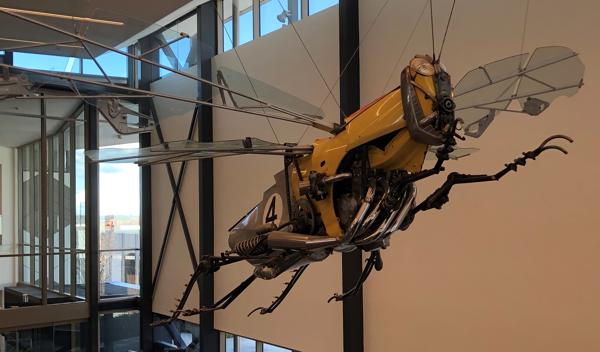 The second hanging artwork Corbett calls ‘Beechy Grasshopper’ and it has a 4.8-metre wingspan with wings made of ‘glass car windows’. More information about the installation can be found on Corbett’s website.