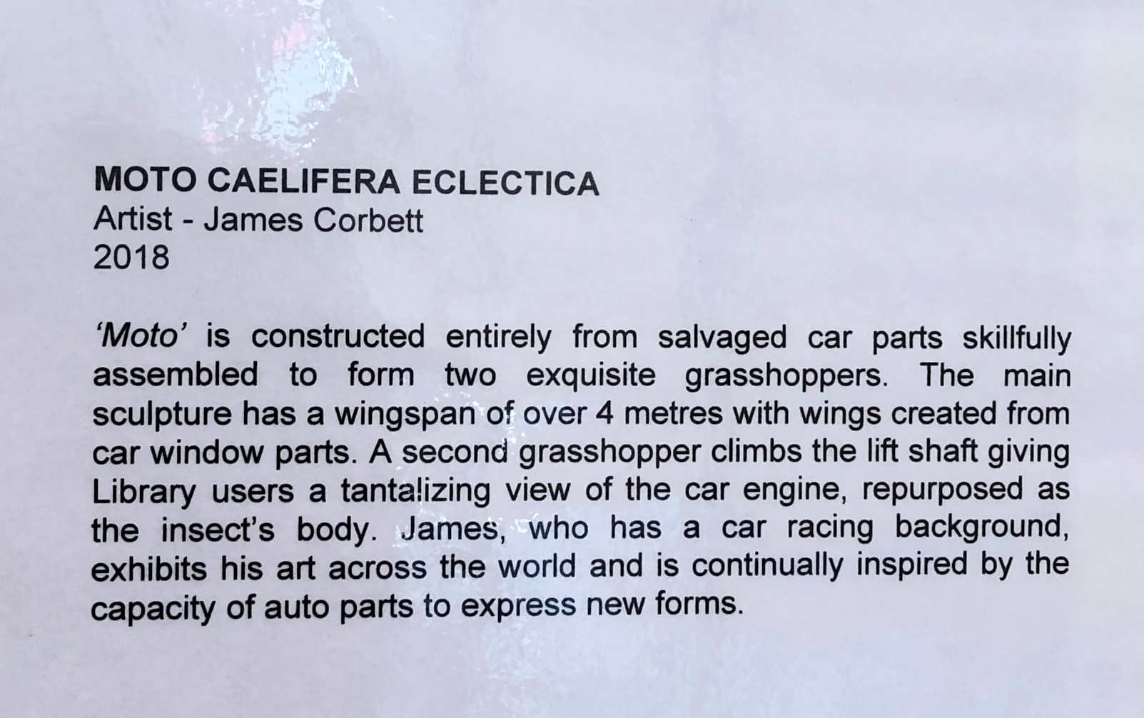 Corbett created two works as part of the installation. He calls one ‘The Green Kawasaki Grasshopper’ and it is attached to the wall. In constructing the works, he writes: