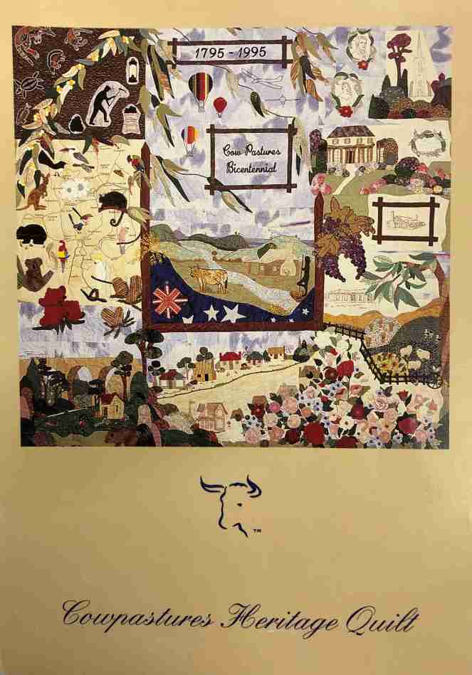 The Camden Quilters commissioned a ‘story quilt’ told through the lens of local women, who took a holistic approach to the Cowpastures story. It was the only memorial created by women, and the collaborative efforts of the quilters created a significant piece of public art. Through the use of applique panels, the women sewed representations of the Cowpastures around the themes of Indigenous people, flora and fauna, ‘wild cattle’, agriculture, roads and bridges, and settlement.[4] The quilt currently hangs in the Camden Library.