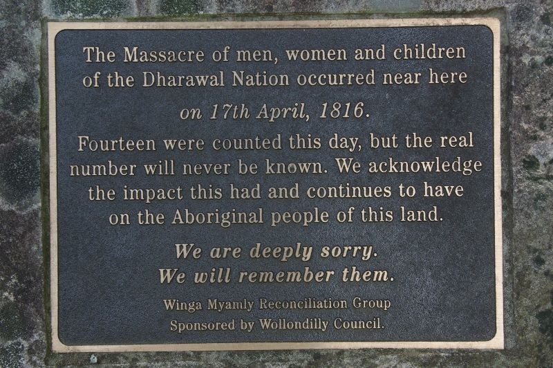The massacre of men, women and children of the Dharawal Nation occurred near here on 17 April 1816. Fourteen were counted this day, but the actual number will never be known. We acknowledge the impact this had and continues to have on the Aboriginal people of this land. We are deeply sorry. We will remember them. Winga Mayamly Reconciliation Group. Sponsored by Wollondilly Shire Council.