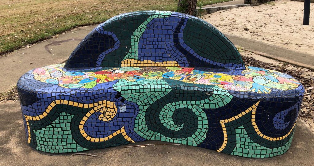 The artwork is a bench covered in mosaic tiles and is all but forgotten in the corner of the park amongst the slides, swings and climbing equipment for the youngsters.