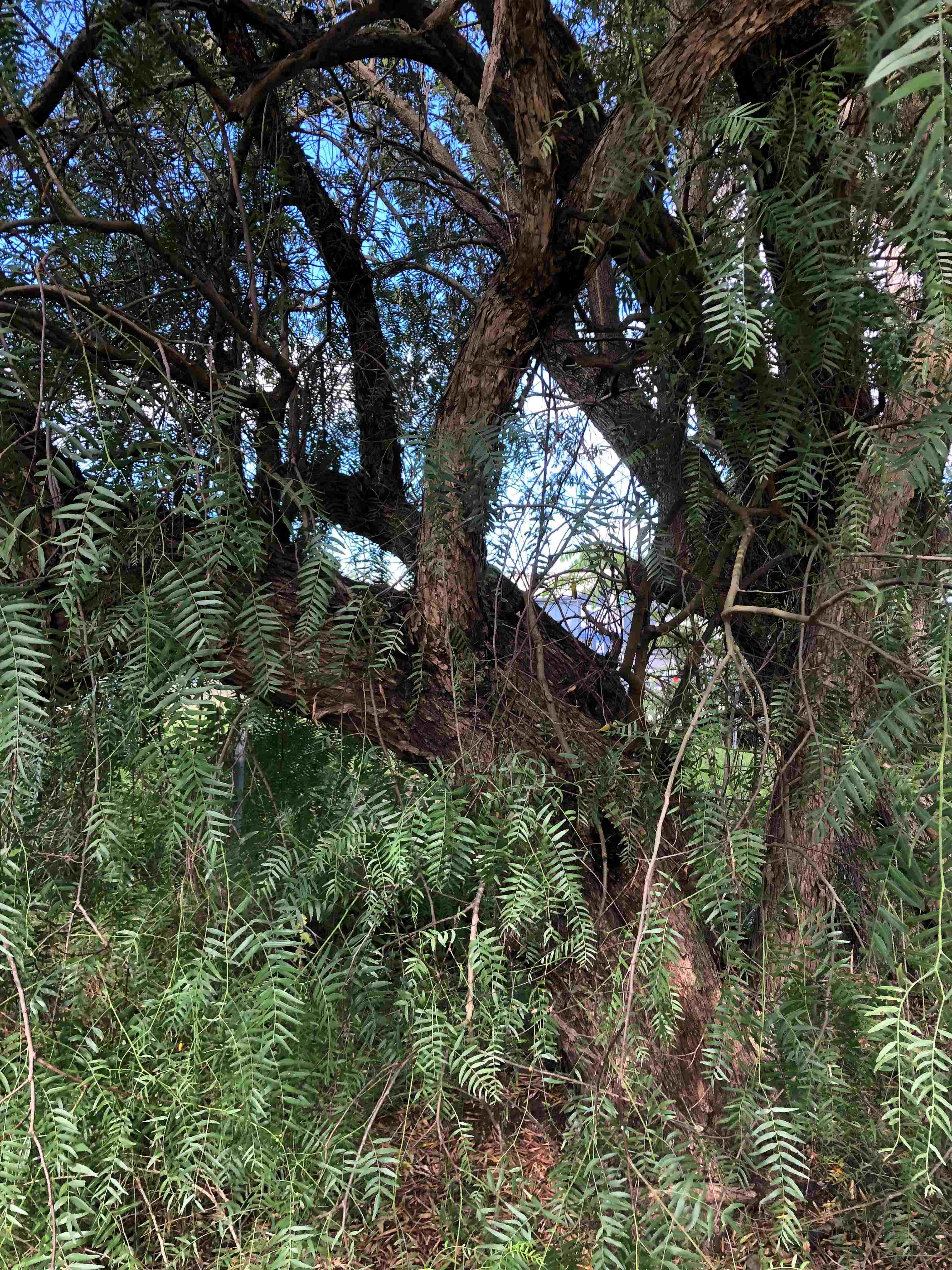 In Australian Garden History magazine, John Dwyer writes that the pepper tree (Schinus ariera, syn. Schinus molle) or peppercorn tree has been popular nationwide for over 150 years. Originally from the Americas, from Mexico to Peru, it was first introduced into Australia in the mid-19th century. Country towns across inland New South Wales were supplied with specimens from the 1860s from the Adelaide Botanic Gardens. (Dwyer, 2023)