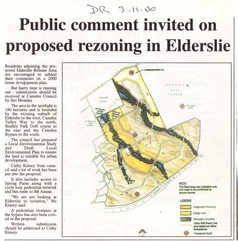 In 2000 the state government identified the Elderslie Urban Release Area for redevelopment under NSW Urban Development Program. The Elderslie area was zoned rural then, with a minimum subdivision of 40 ha. (Godden, Mackay and Logan 2001)