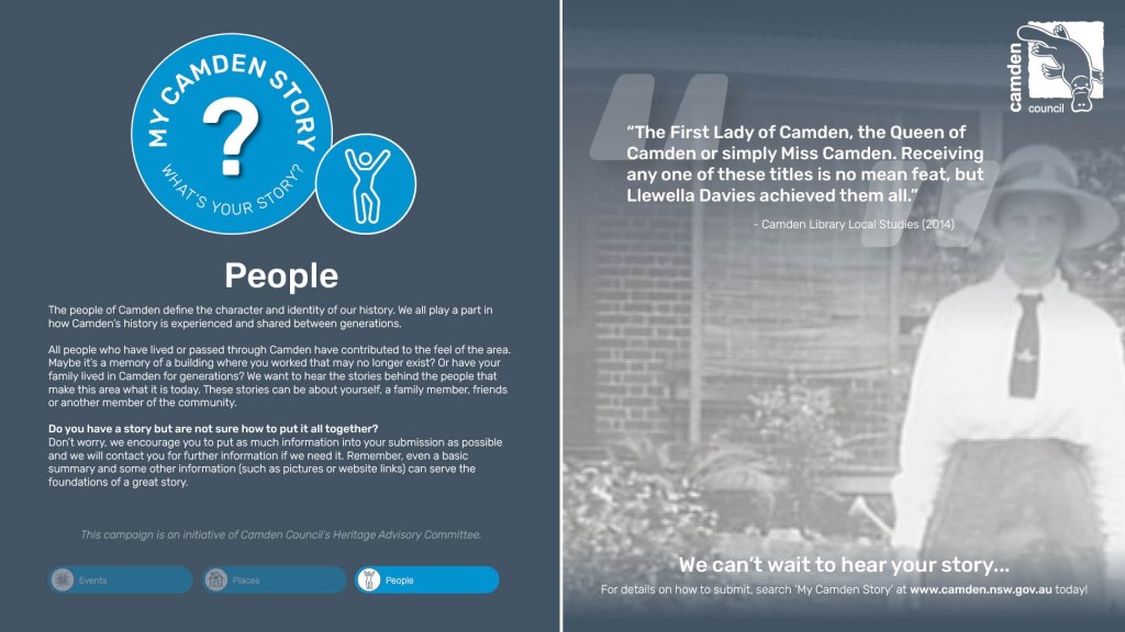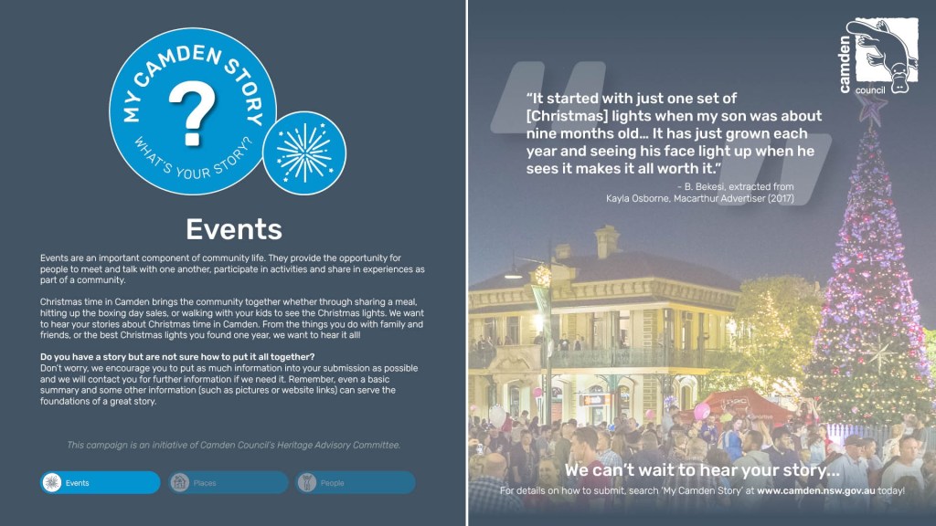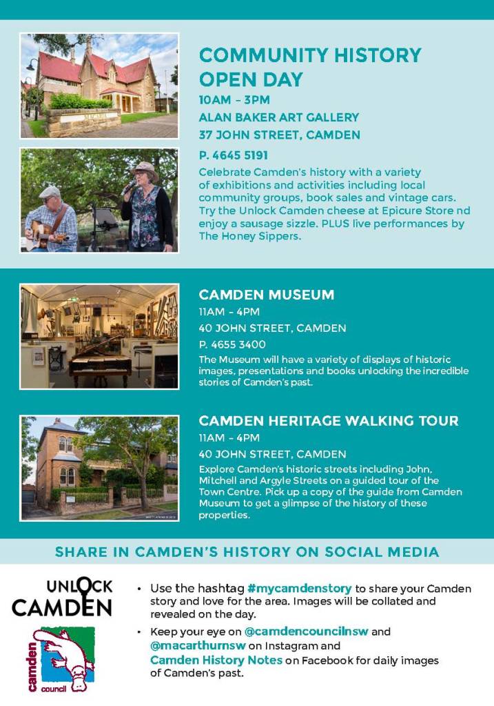 “Residents are encouraged to share photos and stories that showcase their Camden story, historic and modern photos, and anything that shares why they are in Camden and why they love Camden,” said Ms Aulsebrook. (Camden Advertiser, 19 August 2019)