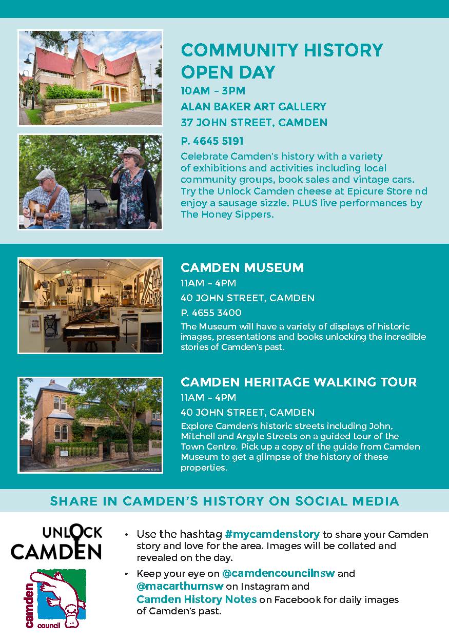 Unlock Camden was an initiative of the Camden Council Heritage Advisory Committee to tell the Camden story and has been ably assisted and coordinated in conjunction with the work of Camden Council staff.