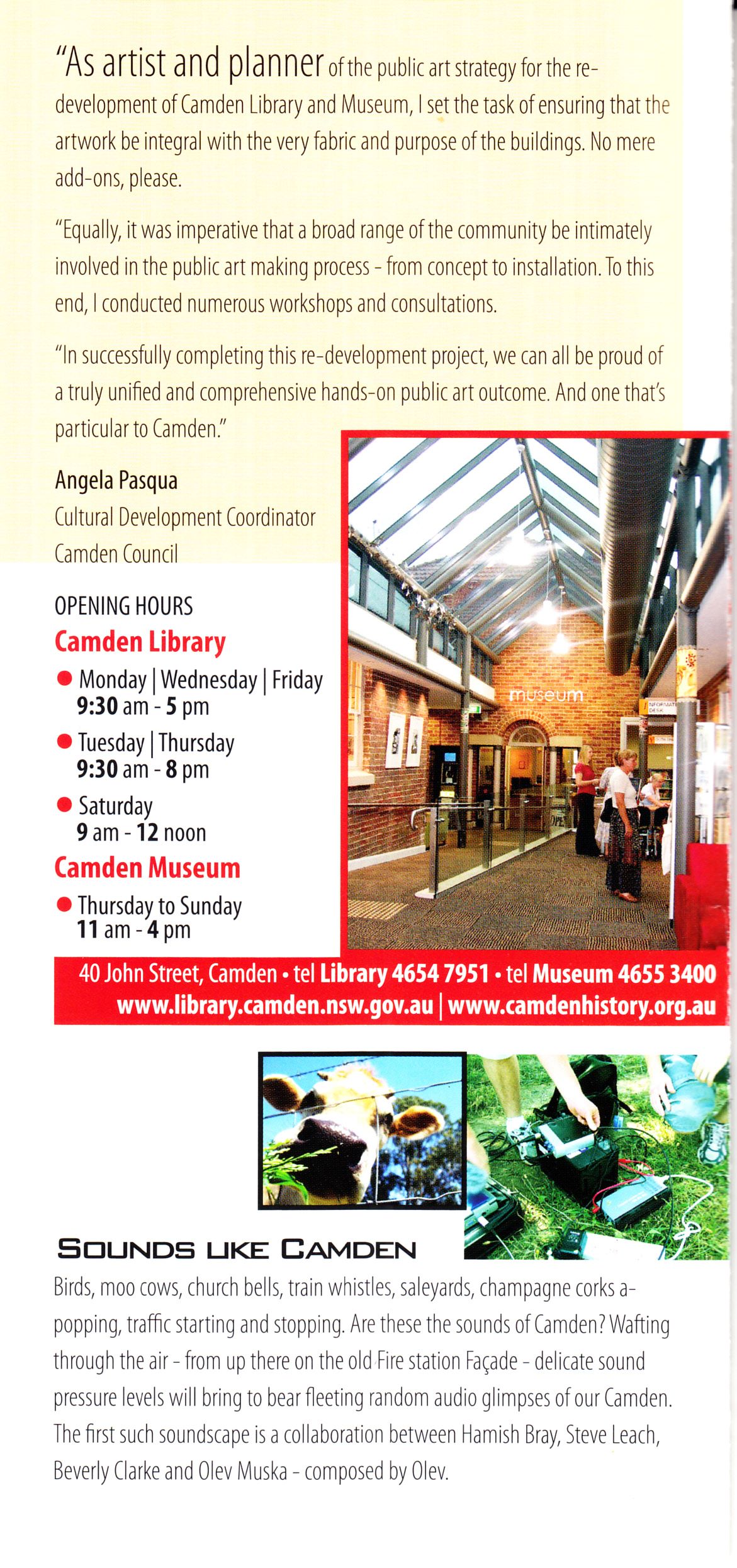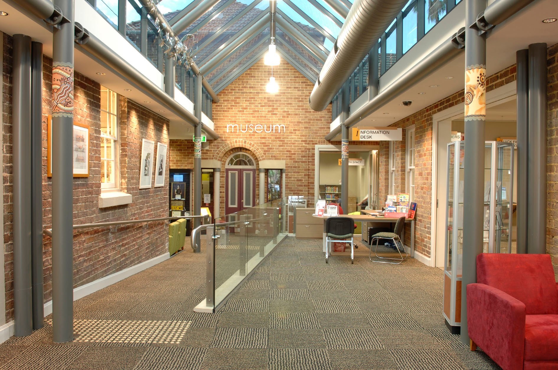 The aim of the 2007 redevelopment project was to integrate three former historical buildings, fire station, school of arts and council offices, into a contemporary functional space for the use of the Camden community using the adaptation principles outlined by the Burra Charter (2013). The former school of arts was occupied by Camden Library, while the Camden Museum was located in the former Camden Council offices.