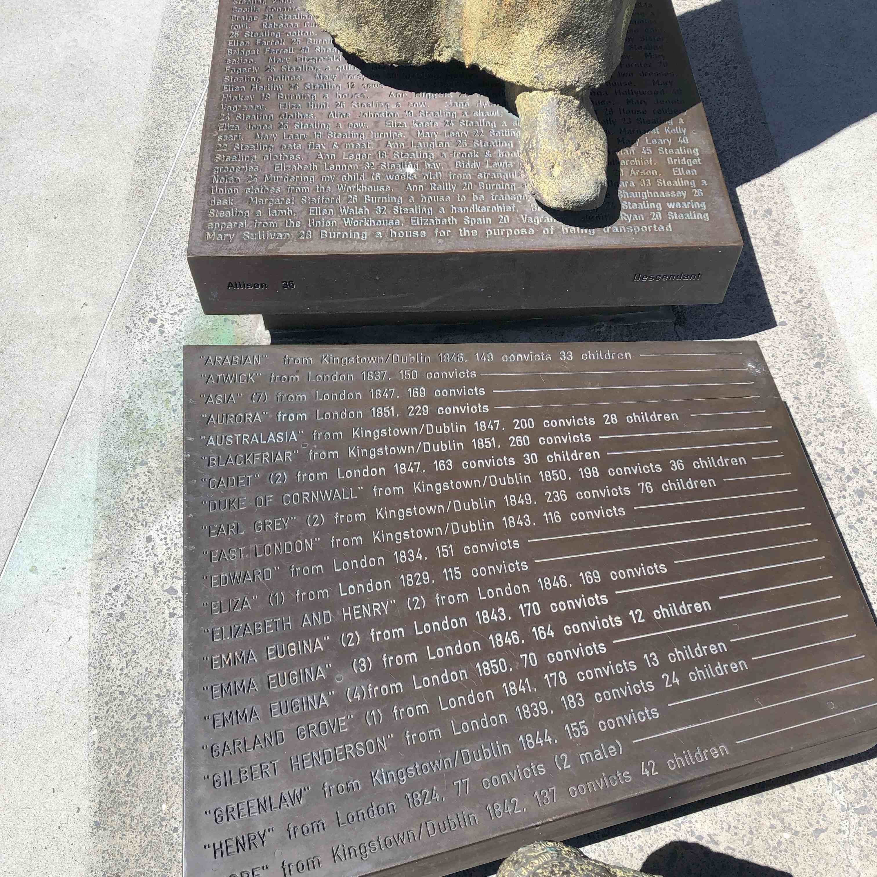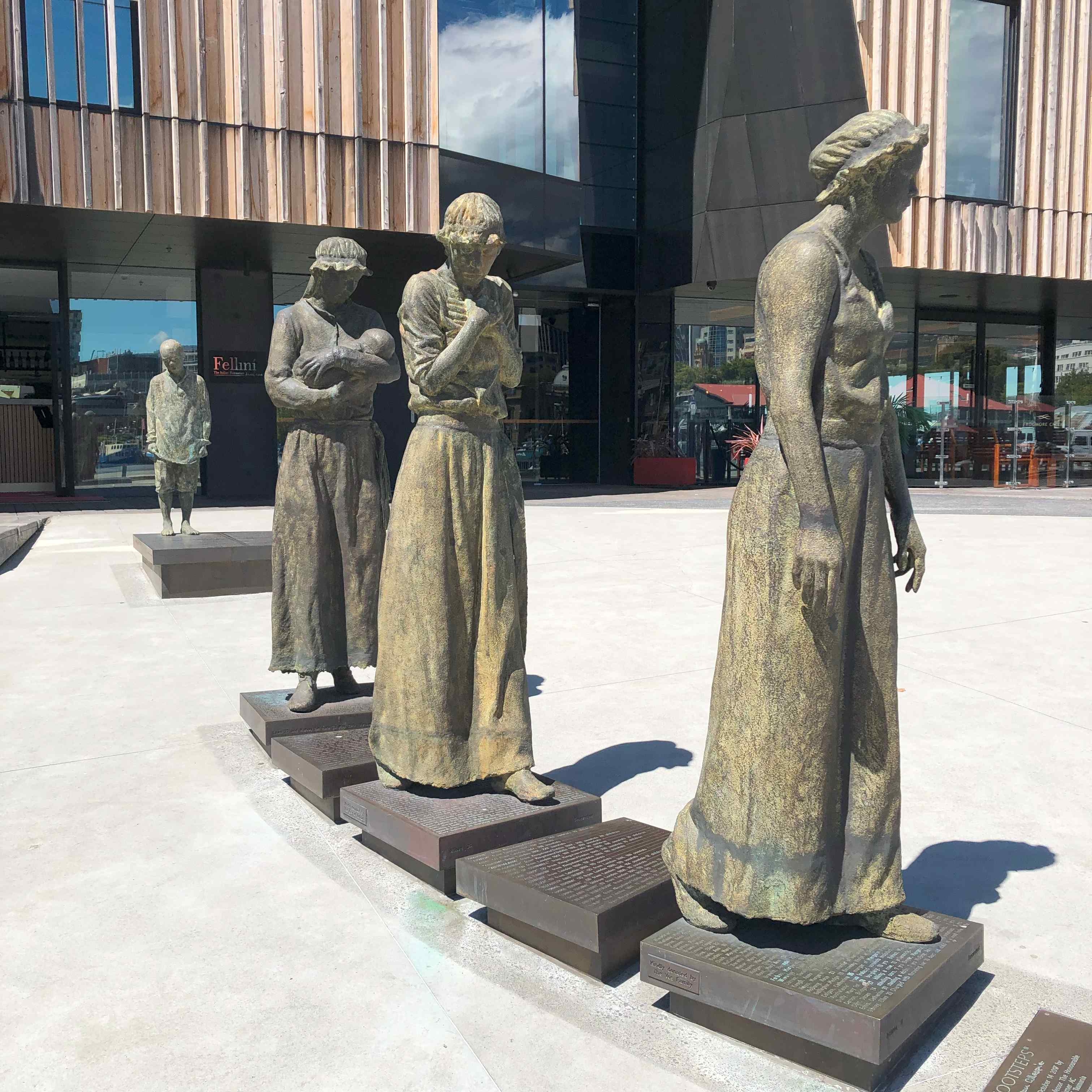 These stories have been commemorated in two sets of statues, one on the Hobart waterfront and one at the Cascades Female Factory in South Hobart, by Irish sculptor Rowan Gillespie.