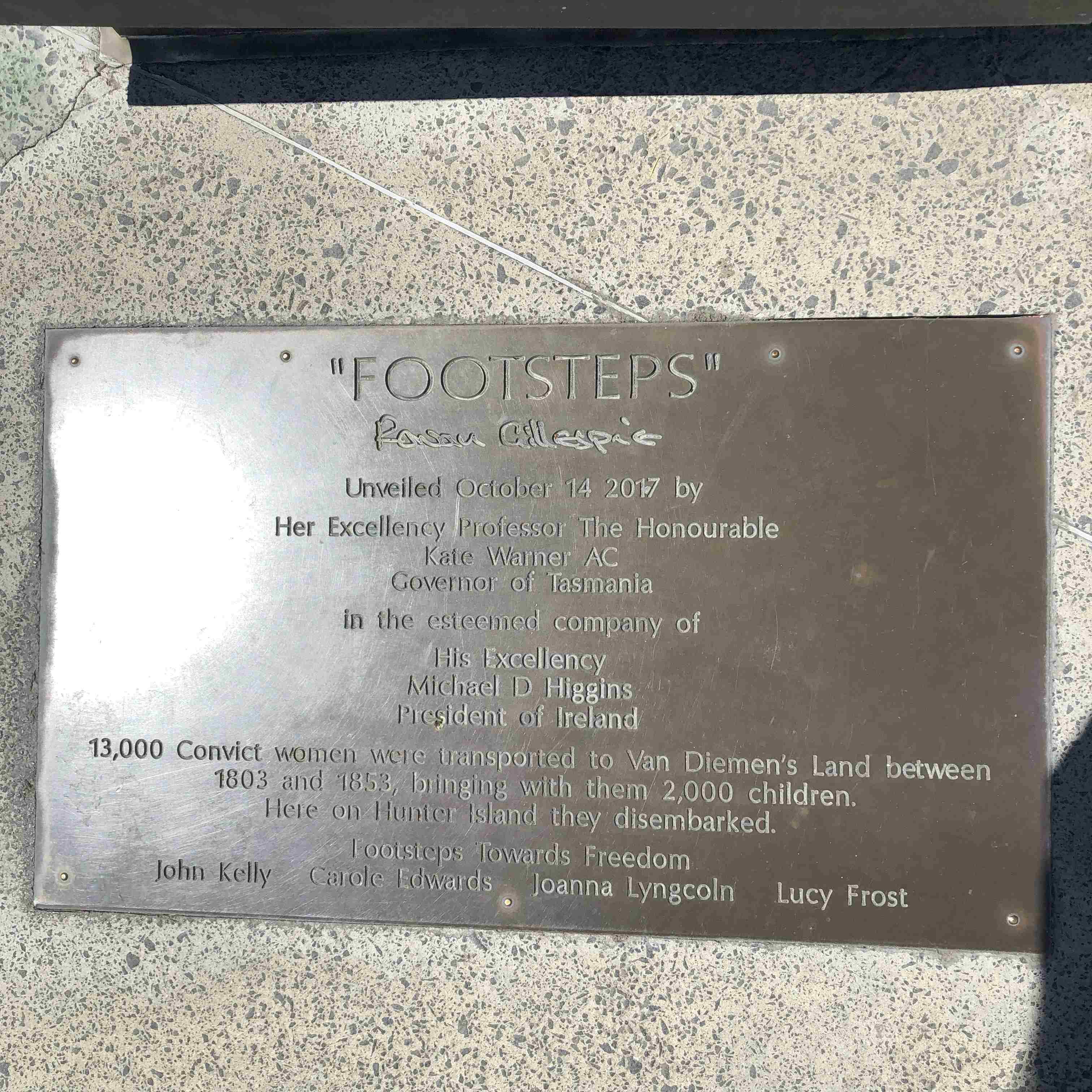 In 2017, the Footsteps Towards Freedom statues were installed on the Hobart waterfront and unveiled by the President of Ireland, Michael Higgins, and the Governor of Tasmania, Kate Warner.