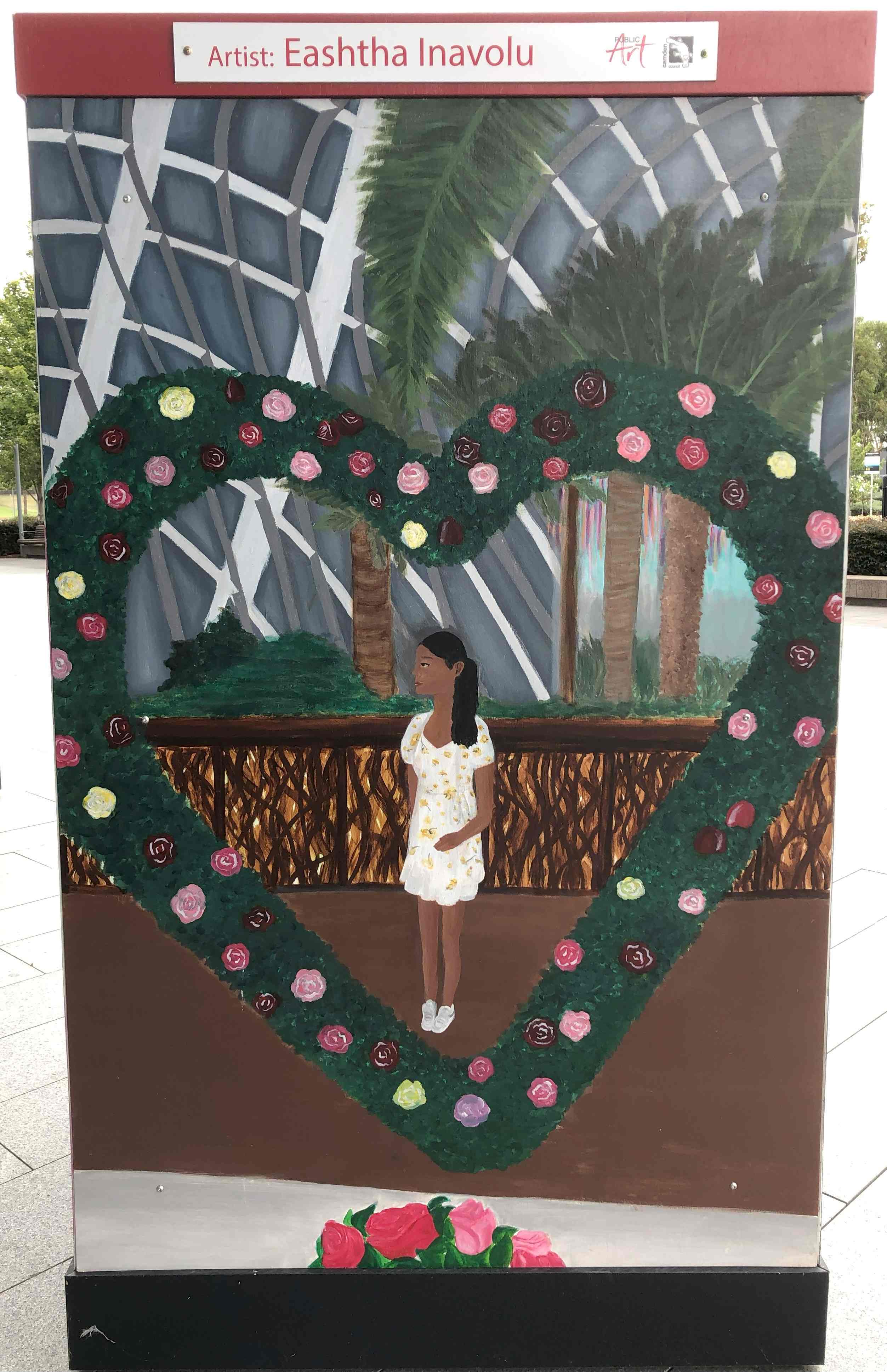 My artwork is based upon a picture of me that was taken during a family trip. The painting reflects my love for nature and plants. The colourful flowers on the heart represent all the people who bring joy to my life. I chose to paint this because it embraces who I am in an indirect way.