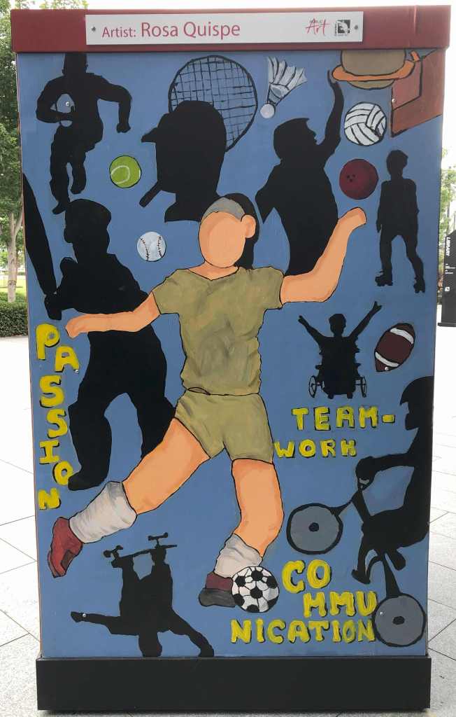 My artwork is based on how sport brings everyone together. I show a little of each sport, whether it is a ball or a player. As a personal touch, I decided to highlight football, since football has helped me to understand Australia’s culture and blend with the people in the community. I added keywords, such as ‘communication’, which means that through sport we can know other people better. ‘Passion’ that motivates people to commit in sports and be able to achieve their goals. Lastly, ‘teamwork’ is in every sport, whether it is played 1vs1 or in groups. It always involves supporting and helping each other. My main message to get across is that sports leads to people being united and being a big family, without exception.