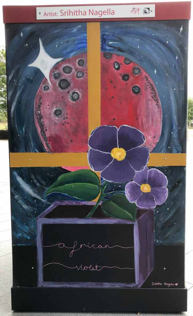 I painted this on my board because it holds some of my favourite moments. The pink moon represents the blood moon that I have always wanted to see. So, the night of the eclipse I waited all night and then fell asleep when it rose. The African violets represent the ones on my windowsill.