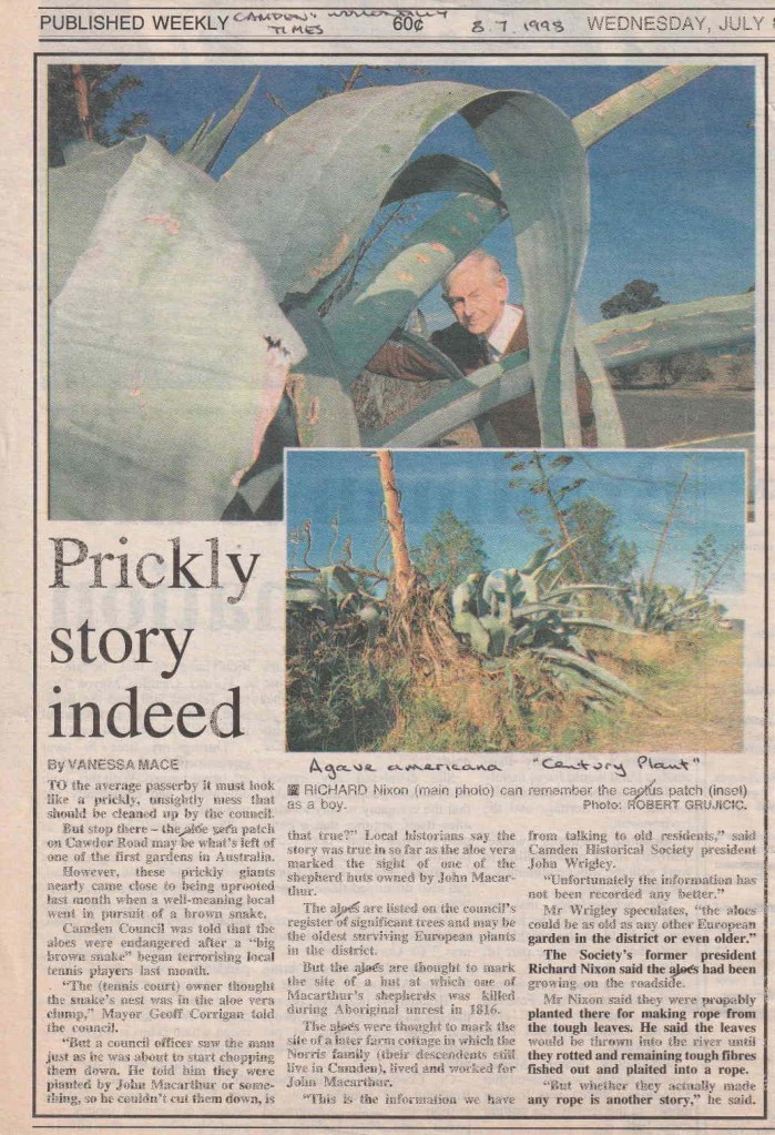 There was speculation in the article that the agave could be some of the oldest plants introduced by Europeans to the Cowpastures in their colonial gardens. (Vanessa Mace, ‘Prickly Story Indeed’. Camden-Wollondilly Times, 8 July 1998)