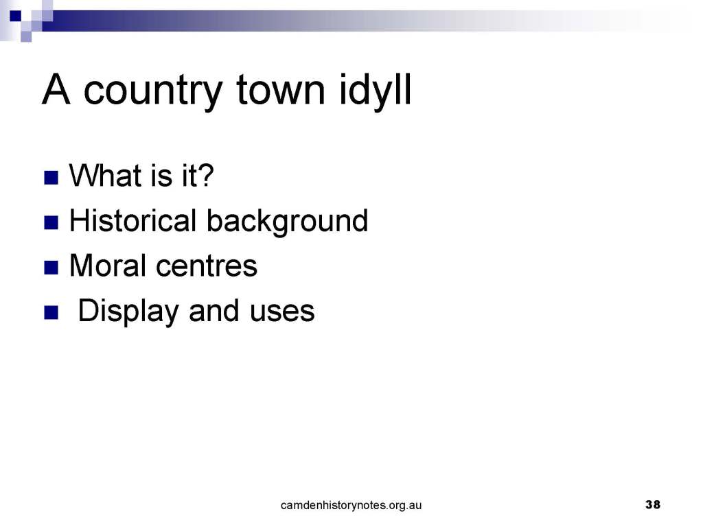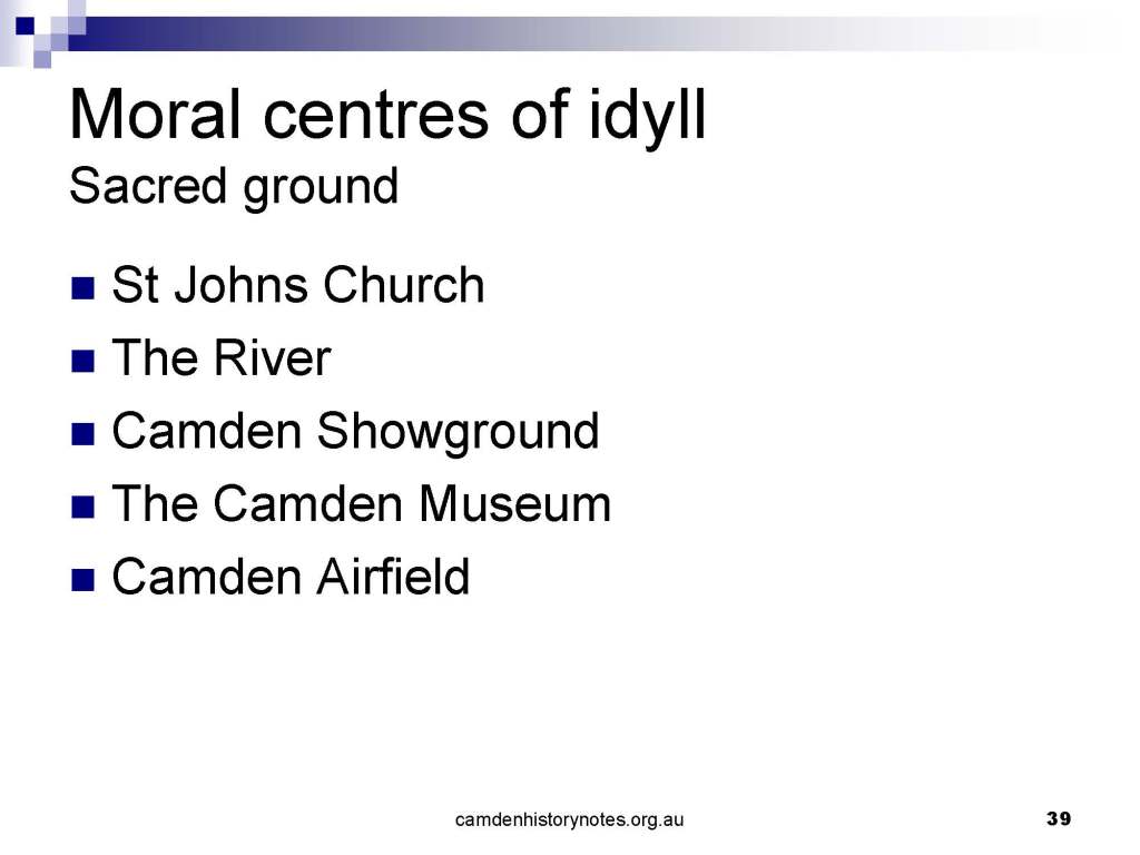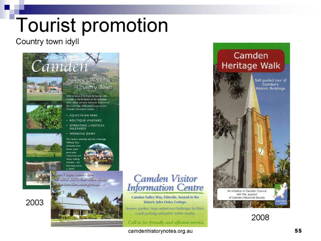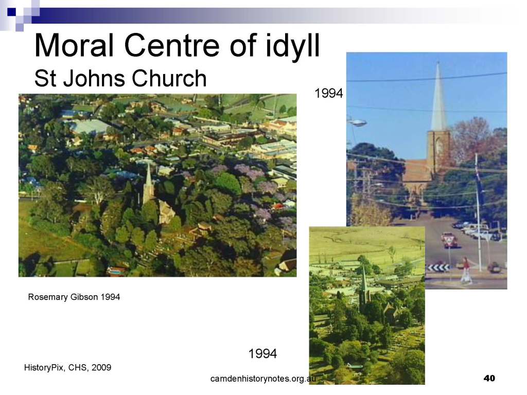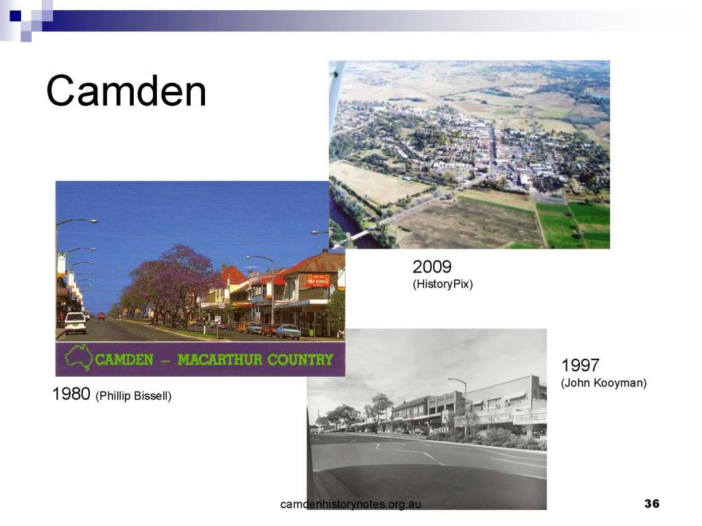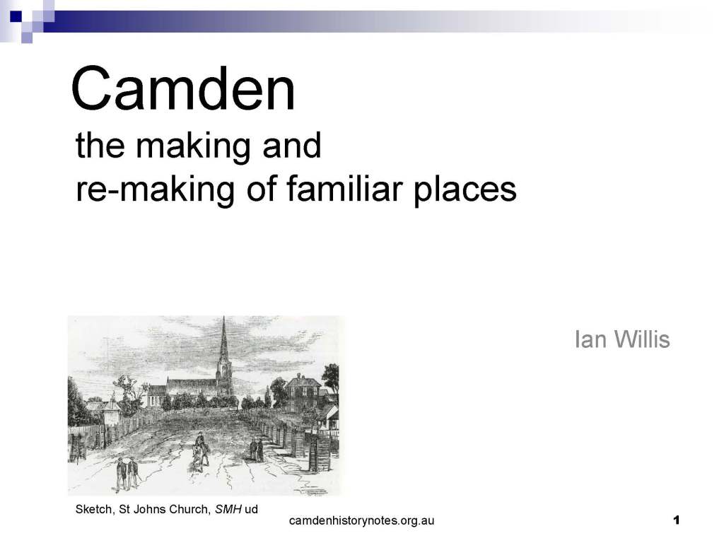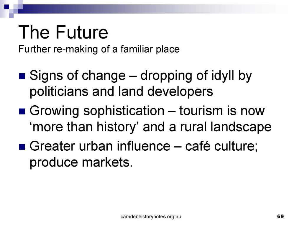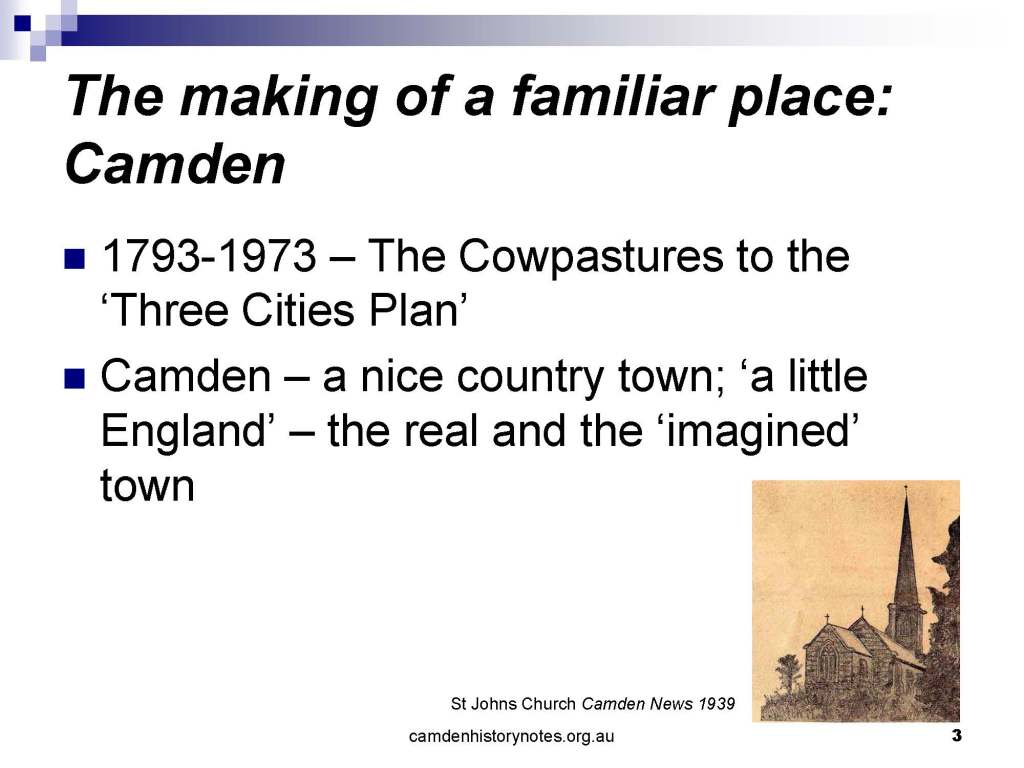 This presentation examines Sydney’s urban expansion into the local area (in Elderslie, Oran Park, South Camden), which threatens to destroy what is left of Camden’s notion of being a country town. Fact or fiction? Many in the local community desire to retain Camden’s image as a country town. Is this just a dream, or is there some reality to this idea? Many local people talk about retaining Camden’s ‘country town atmosphere’ or ‘keeping Camden country’. The town is described as ‘picturesque’ and having ‘charming cottages’. To others, Camden is a ‘working country town’ or ‘my country town’. These values and ideas are connected to the reality of trying to keep what is left of Camden as a country town. Tourist brochures use these ideas to picture idyllic rural scenes. Land developers have scenes of families frolicking in the meadows with their children. These values and ideas are based on nostalgia. They look back to the early days of Camden, when daily life in the town was uncomplicated, innocent, and genuine, with traditional rural values. When people talked to their neighbours and stopped for a chat in the street, they were based on nostalgia. Nostalgia and yearning for a lost past have been re-created in a ‘country town idyll’ in Camden, NSW today.