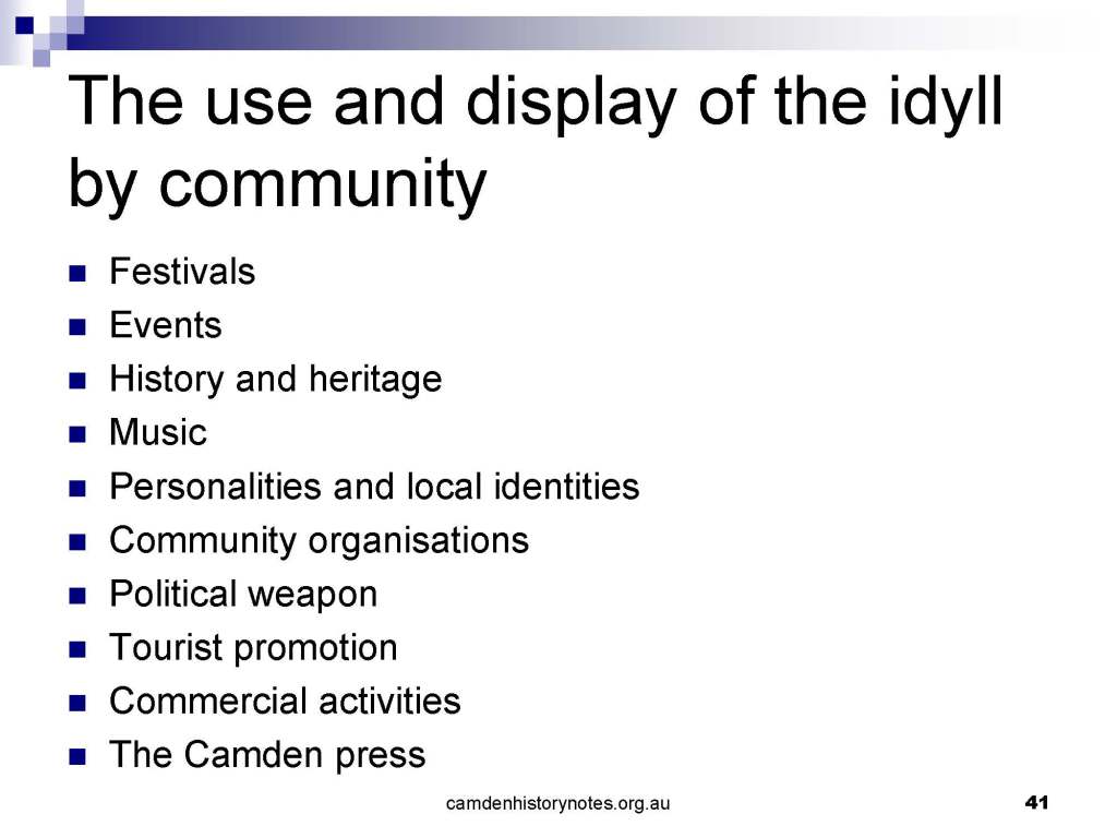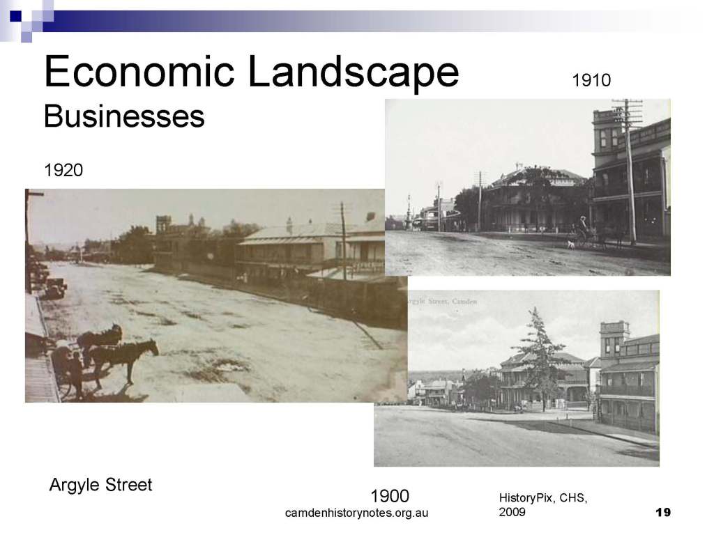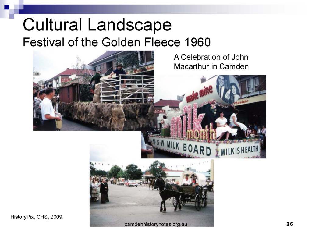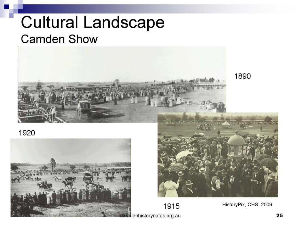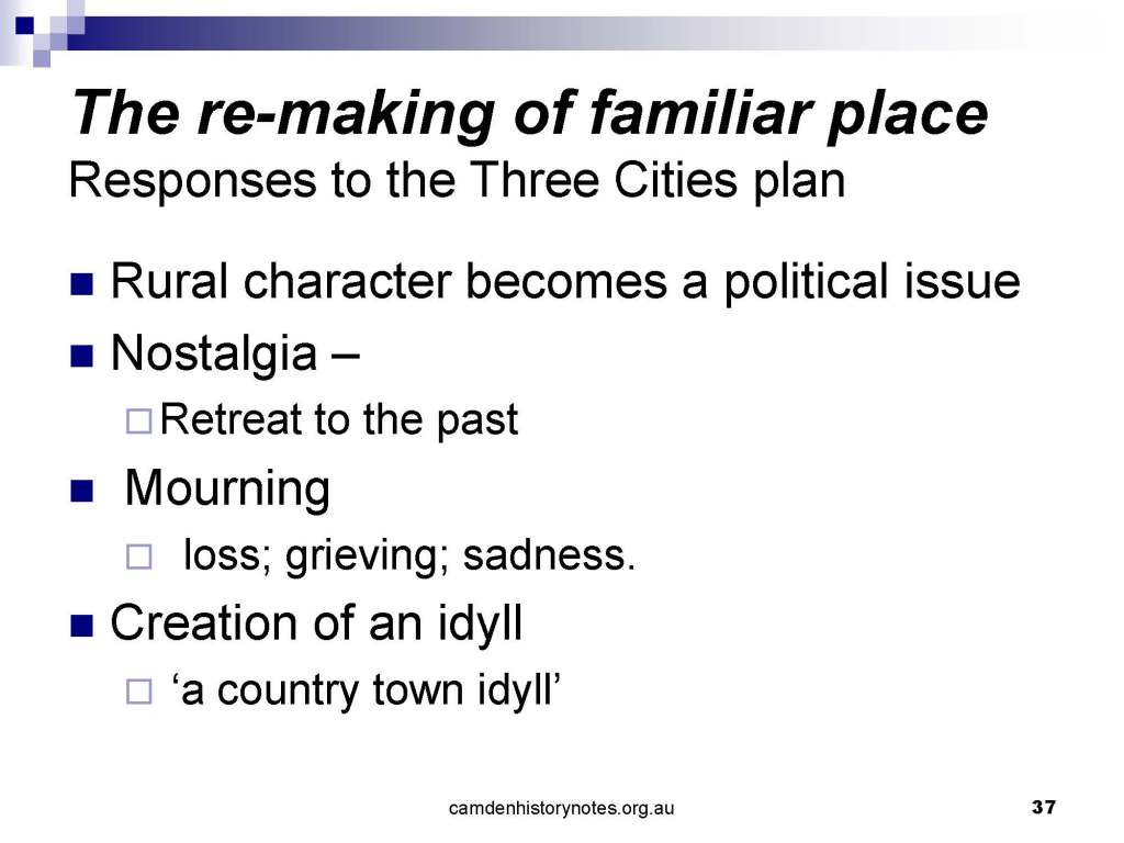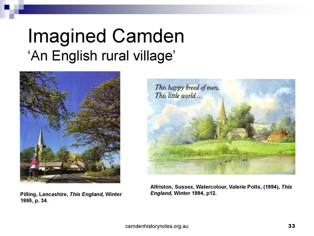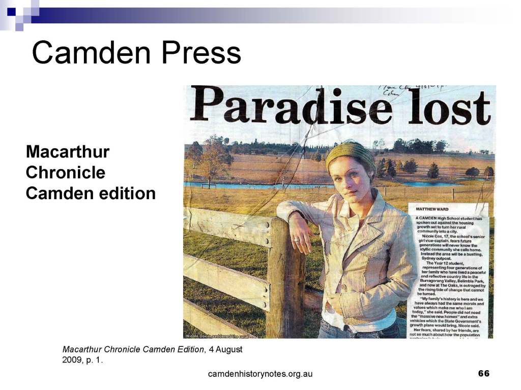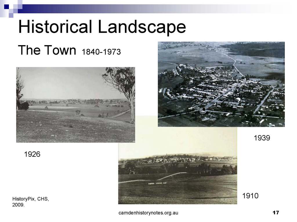 This presentation examines Sydney’s urban expansion into the local area (in Elderslie, Oran Park, South Camden), which threatens to destroy what is left of Camden’s notion of being a country town. Fact or fiction? Many in the local community desire to retain Camden’s image as a country town. Is this just a dream, or is there some reality to this idea? Many local people talk about retaining Camden’s ‘country town atmosphere’ or ‘keeping Camden country’. The town is described as ‘picturesque’ and having ‘charming cottages’. To others, Camden is a ‘working country town’ or ‘my country town’. These values and ideas are connected to the reality of trying to keep what is left of Camden as a country town. Tourist brochures use these ideas to picture idyllic rural scenes. Land developers have scenes of families frolicking in the meadows with their children. These values and ideas are based on nostalgia. They look back to the early days of Camden, when daily life in the town was uncomplicated, innocent, and genuine, with traditional rural values. When people talked to their neighbours and stopped for a chat in the street, they were based on nostalgia. Nostalgia and yearning for a lost past have been re-created in a ‘country town idyll’ in Camden, NSW today.
