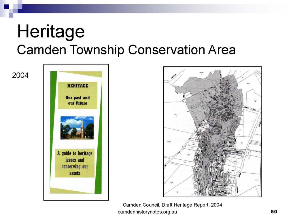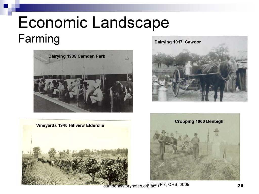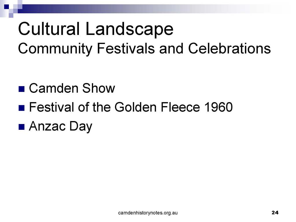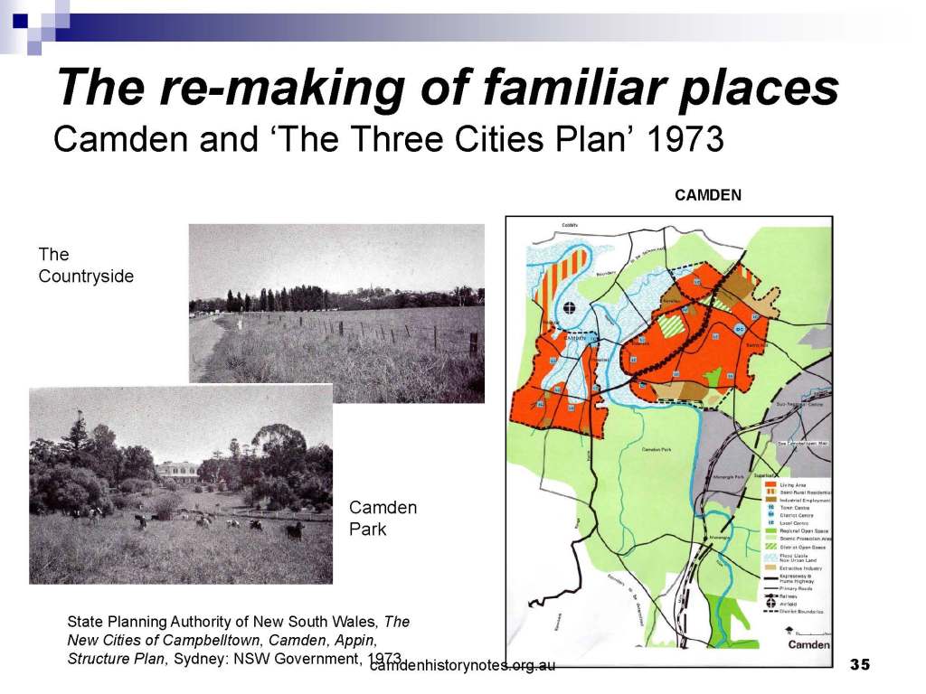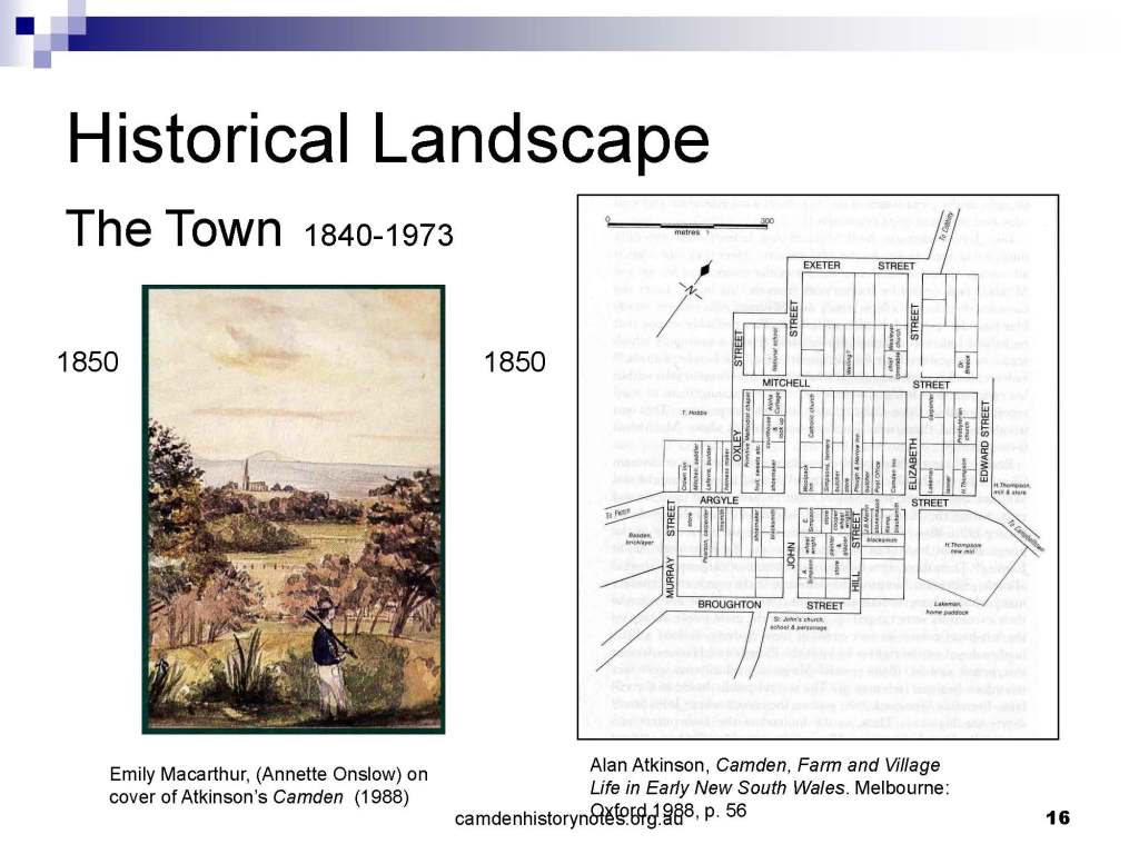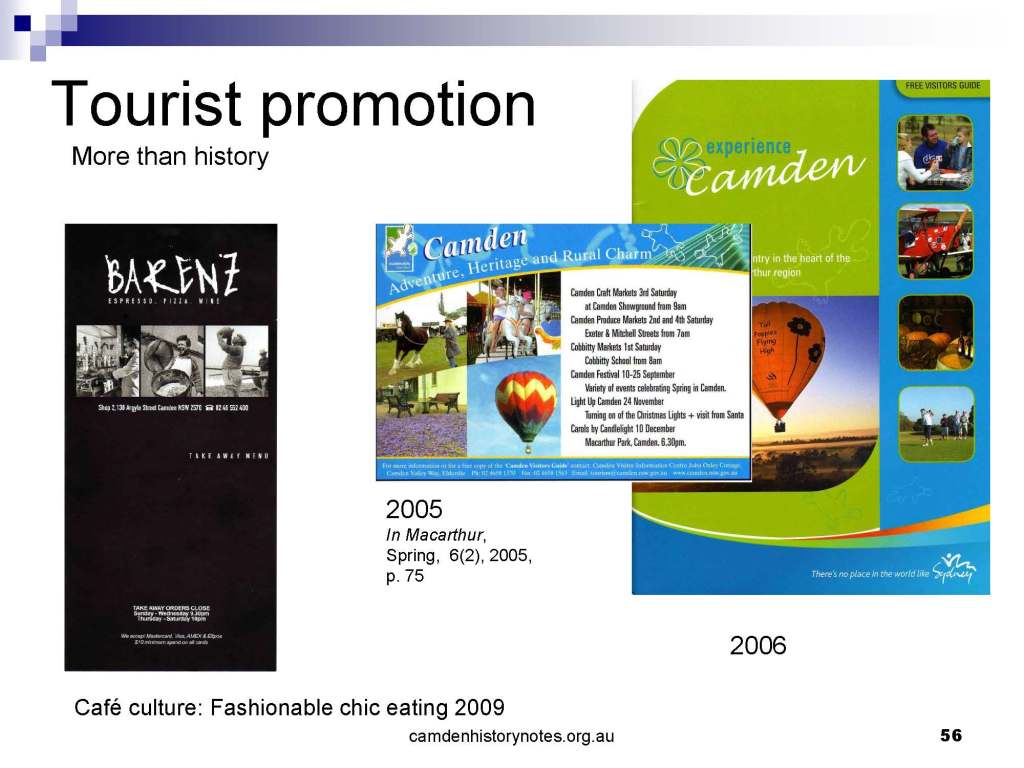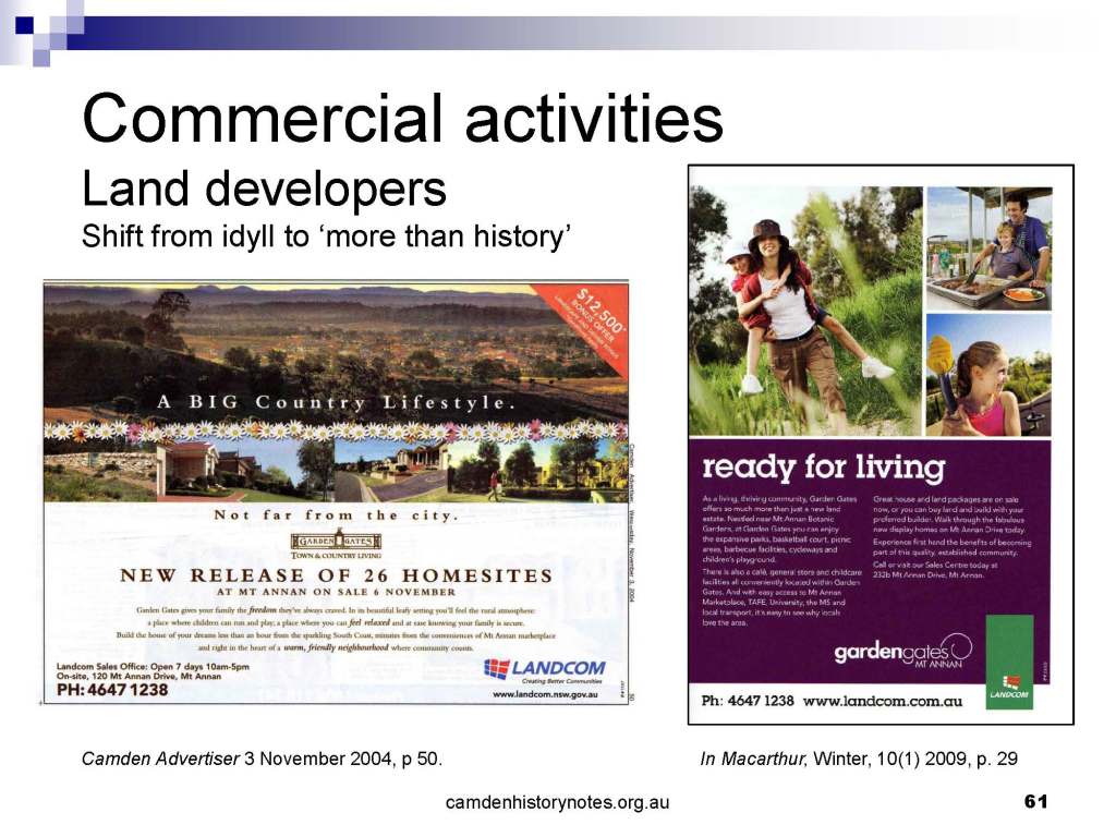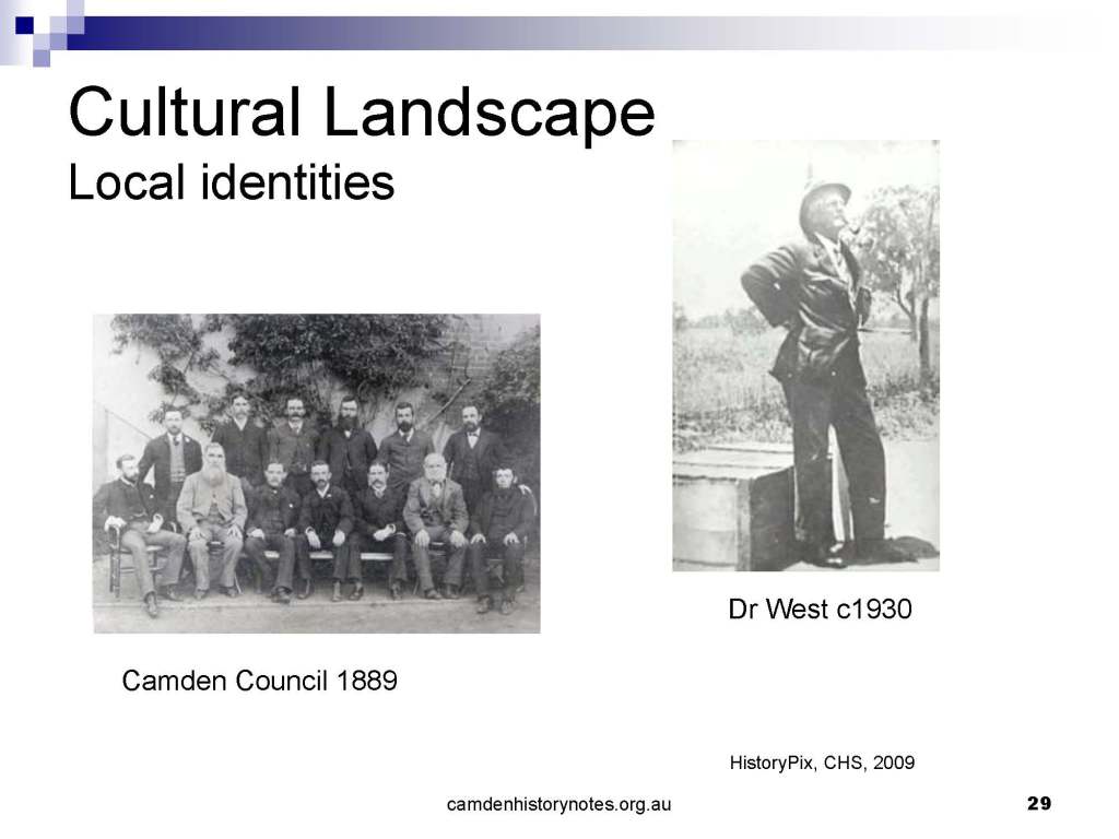 This presentation examines Sydney’s urban expansion into the local area (in Elderslie, Oran Park, South Camden), which threatens to destroy what is left of Camden’s notion of being a country town. Fact or fiction? Many in the local community desire to retain Camden’s image as a country town. Is this just a dream, or is there some reality to this idea? Many local people talk about retaining Camden’s ‘country town atmosphere’ or ‘keeping Camden country’. The town is described as ‘picturesque’ and having ‘charming cottages’. To others, Camden is a ‘working country town’ or ‘my country town’. These values and ideas are connected to the reality of trying to keep what is left of Camden as a country town. Tourist brochures use these ideas to picture idyllic rural scenes. Land developers have scenes of families frolicking in the meadows with their children. These values and ideas are based on nostalgia. They look back to the early days of Camden, when daily life in the town was uncomplicated, innocent, and genuine, with traditional rural values. When people talked to their neighbours and stopped for a chat in the street, they were based on nostalgia. Nostalgia and yearning for a lost past have been re-created in a ‘country town idyll’ in Camden, NSW today.