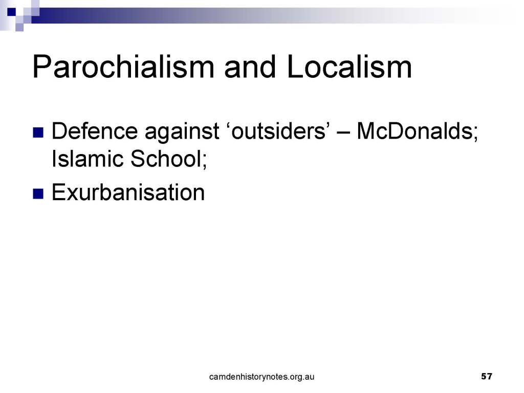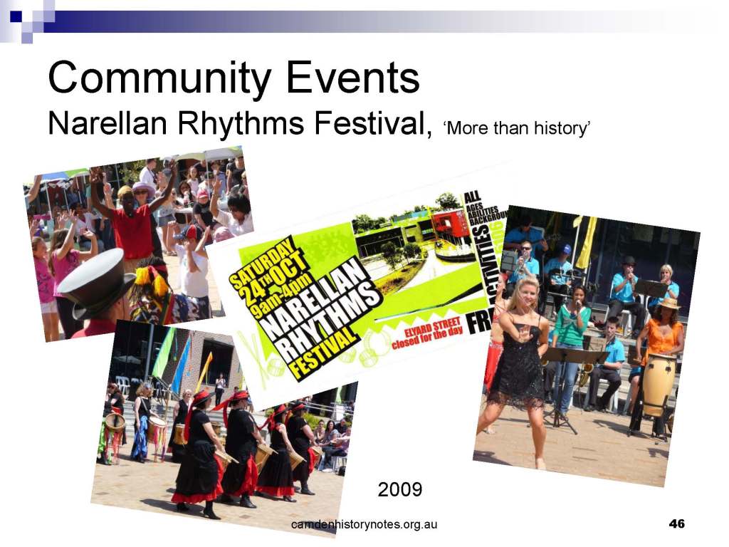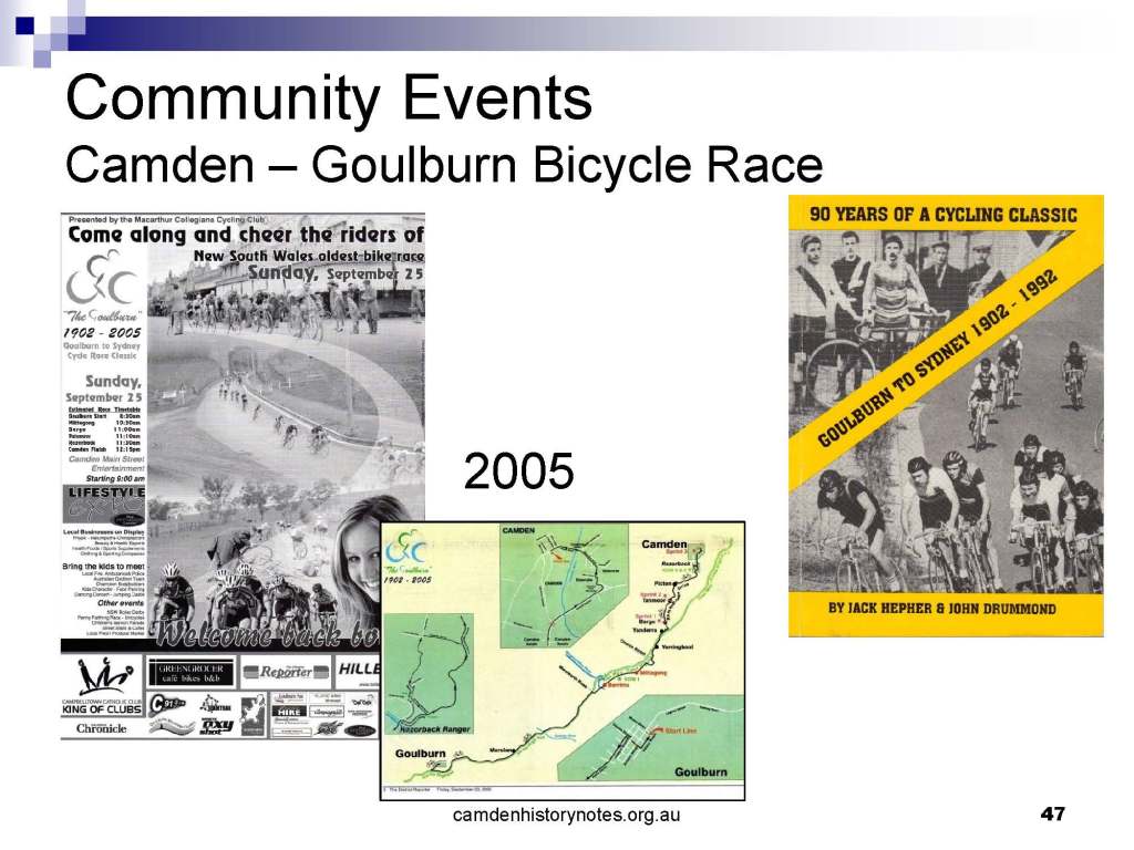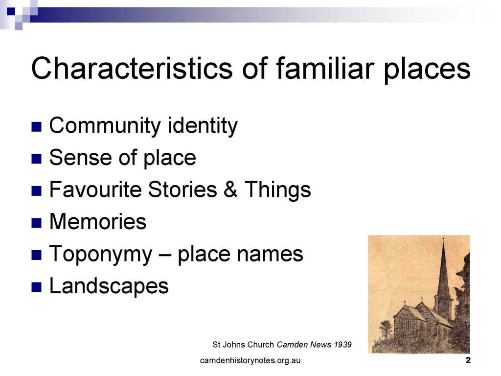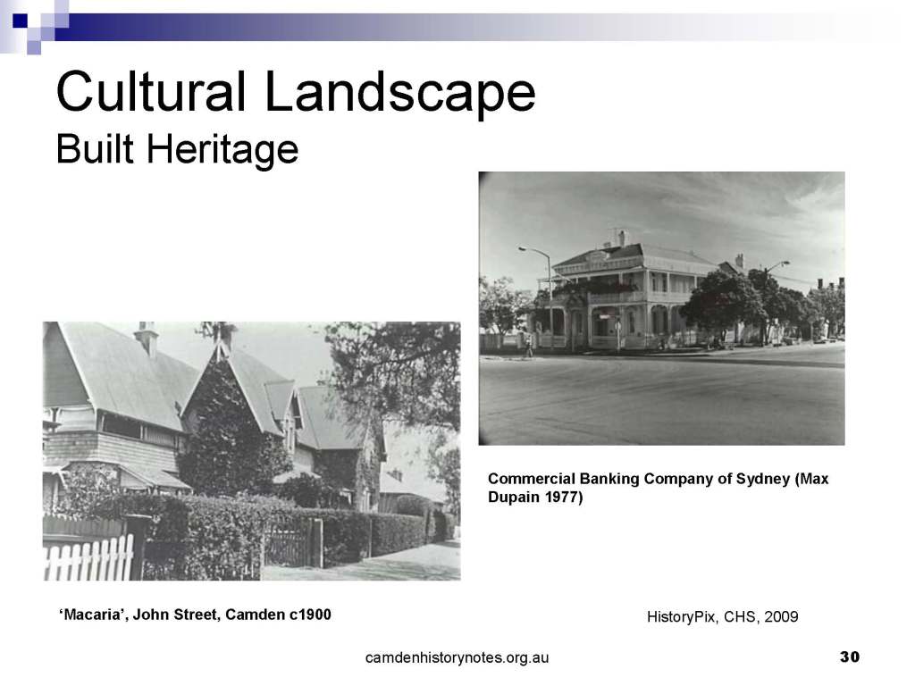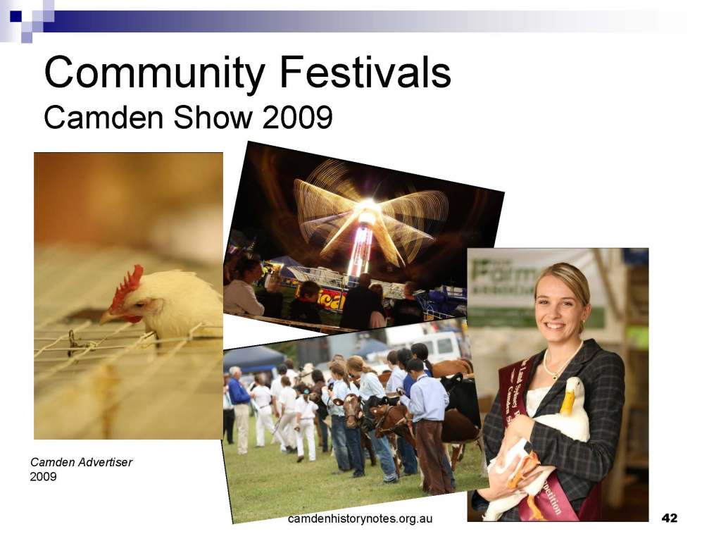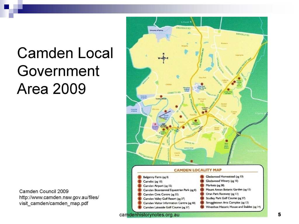 This presentation examines Sydney’s urban expansion into the local area (in Elderslie, Oran Park, South Camden), which threatens to destroy what is left of Camden’s notion of being a country town. Fact or fiction? Many in the local community desire to retain Camden’s image as a country town. Is this just a dream, or is there some reality to this idea? Many local people talk about retaining Camden’s ‘country town atmosphere’ or ‘keeping Camden country’. The town is described as ‘picturesque’ and having ‘charming cottages’. To others, Camden is a ‘working country town’ or ‘my country town’. These values and ideas are connected to the reality of trying to keep what is left of Camden as a country town. Tourist brochures use these ideas to picture idyllic rural scenes. Land developers have scenes of families frolicking in the meadows with their children. These values and ideas are based on nostalgia. They look back to the early days of Camden, when daily life in the town was uncomplicated, innocent, and genuine, with traditional rural values. When people talked to their neighbours and stopped for a chat in the street, they were based on nostalgia. Nostalgia and yearning for a lost past have been re-created in a ‘country town idyll’ in Camden, NSW today.