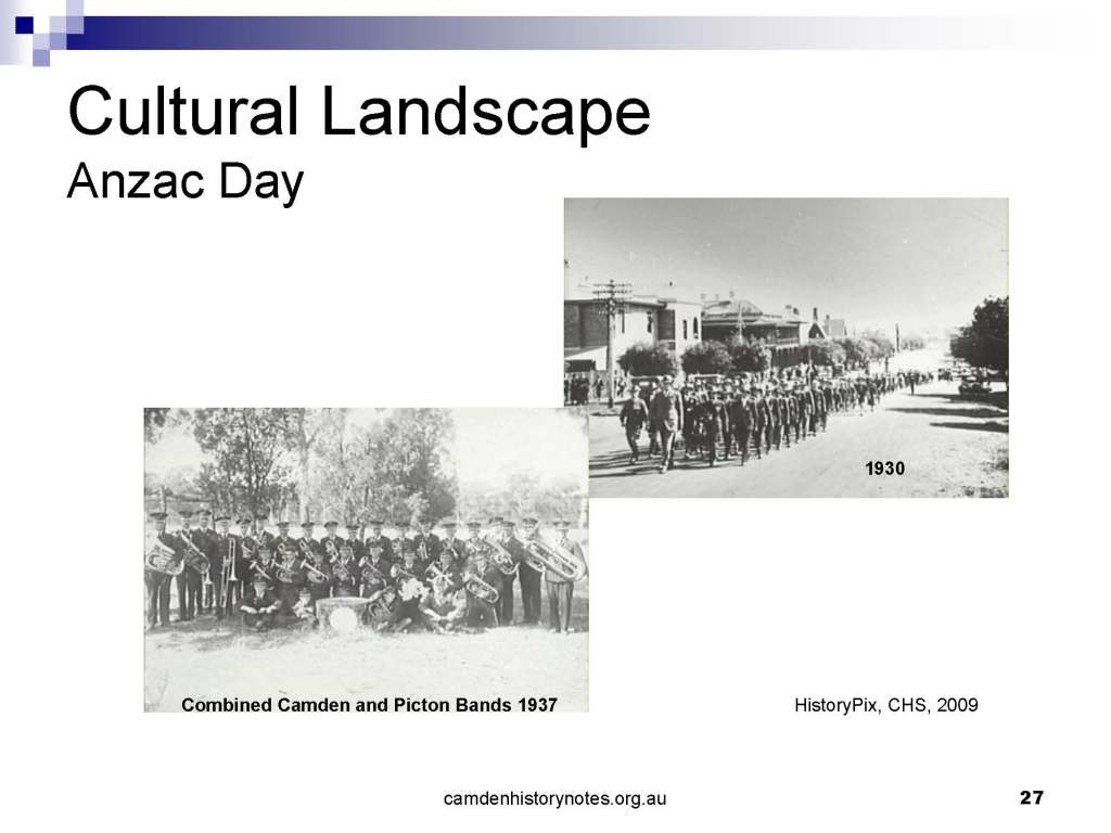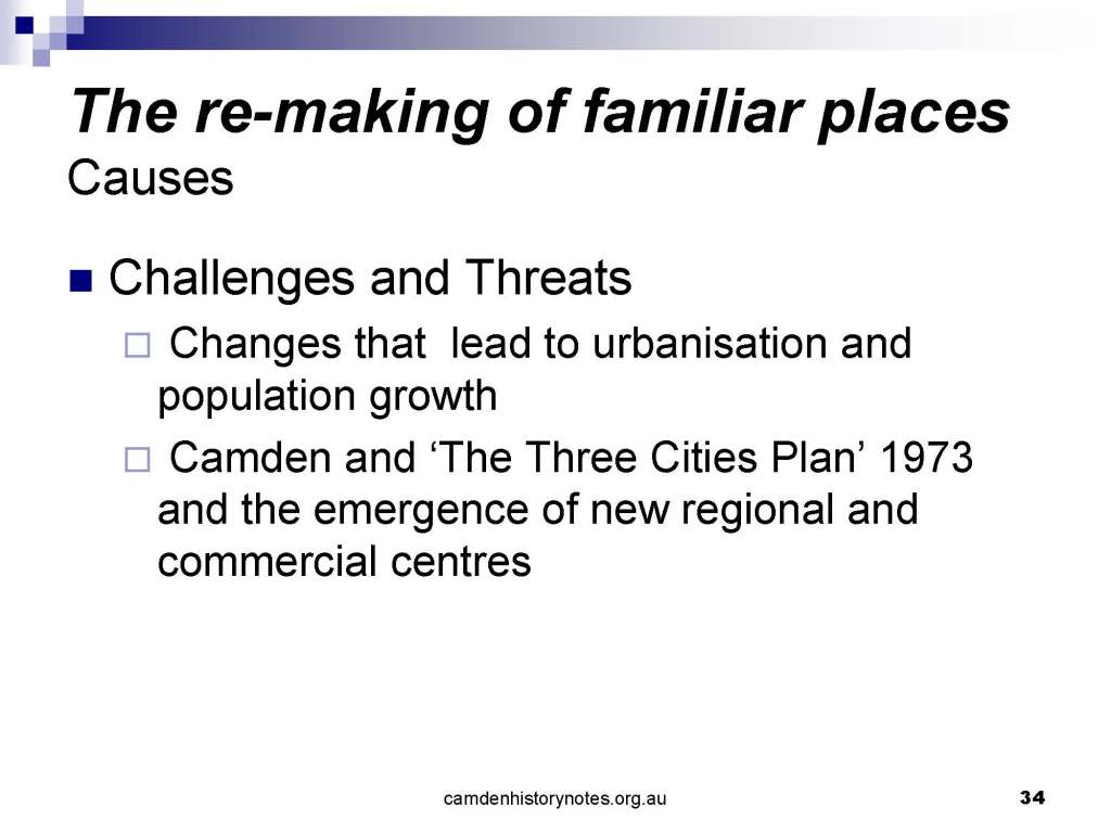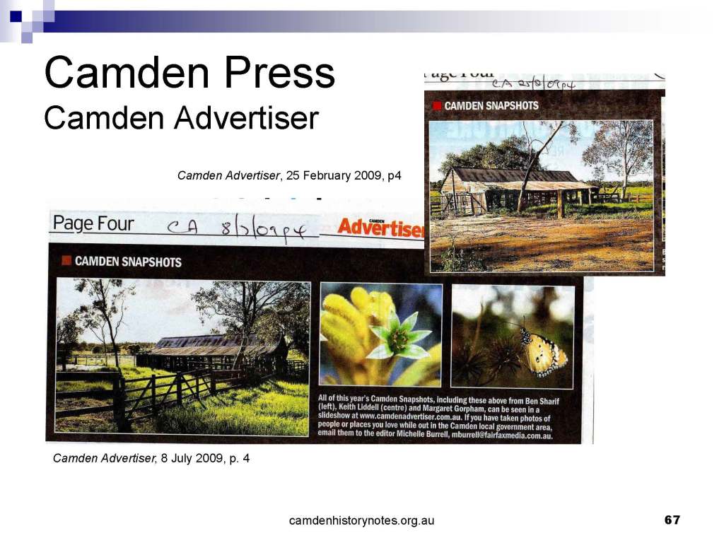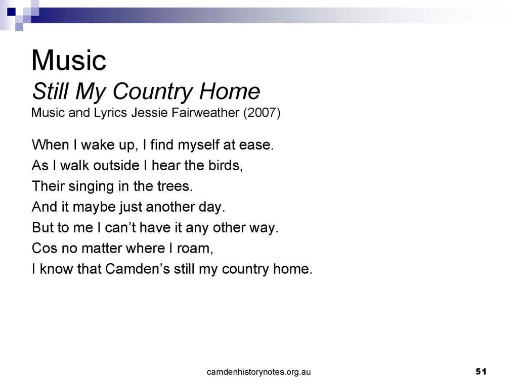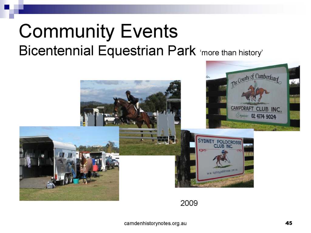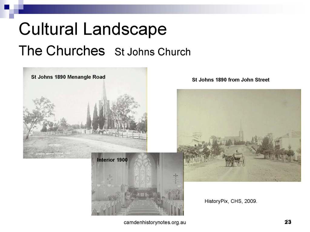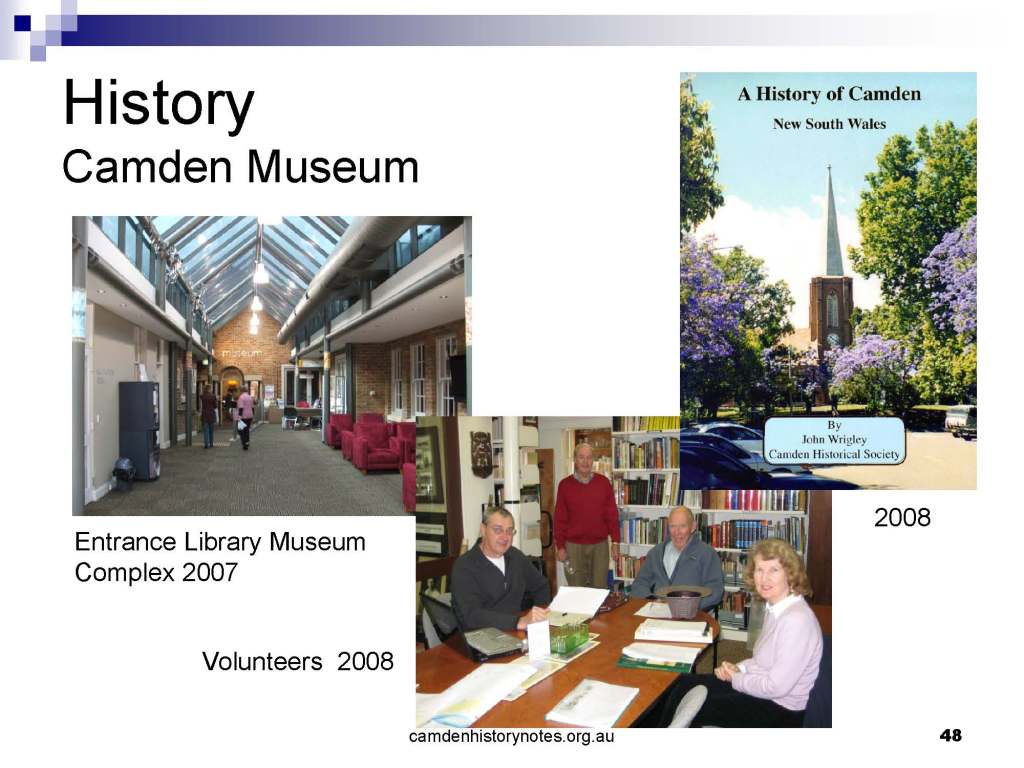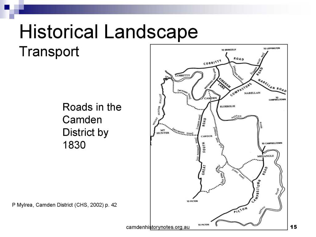This presentation examines Sydney’s urban expansion into the local area (in Elderslie, Oran Park, South Camden), which threatens to destroy what is left of Camden’s notion of being a country town. Fact or fiction? Many in the local community desire to retain Camden’s image as a country town. Is this just a dream, or is there some reality to this idea? Many local people talk about retaining Camden’s ‘country town atmosphere’ or ‘keeping Camden country’. The town is described as ‘picturesque’ and having ‘charming cottages’. To others, Camden is a ‘working country town’ or ‘my country town’. These values and ideas are connected to the reality of trying to keep what is left of Camden as a country town. Tourist brochures use these ideas to picture idyllic rural scenes. Land developers have scenes of families frolicking in the meadows with their children. These values and ideas are based on nostalgia. They look back to the early days of Camden, when daily life in the town was uncomplicated, innocent, and genuine, with traditional rural values. When people talked to their neighbours and stopped for a chat in the street, they were based on nostalgia. Nostalgia and yearning for a lost past have been re-created in a ‘country town idyll’ in Camden, NSW today.