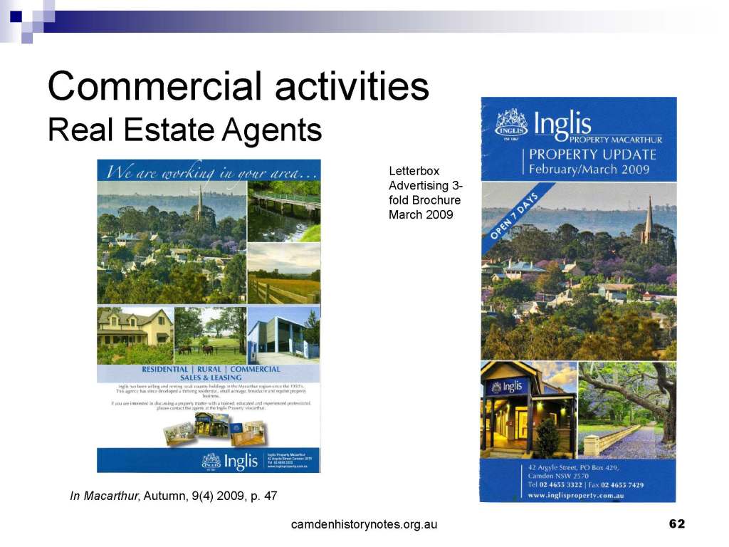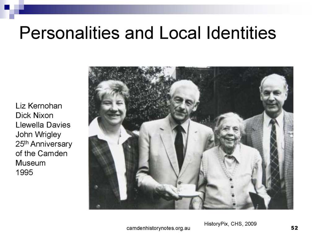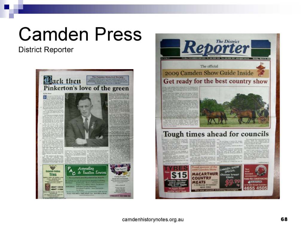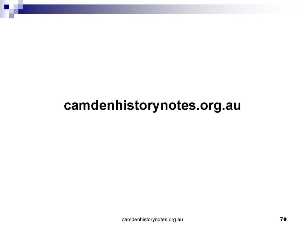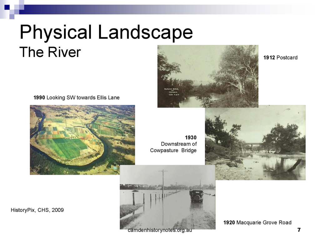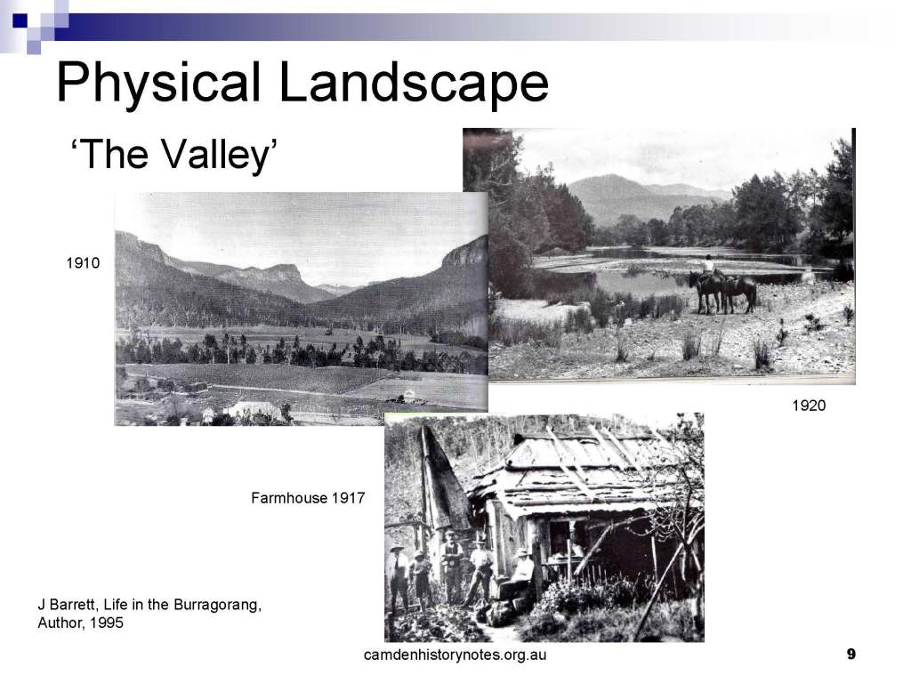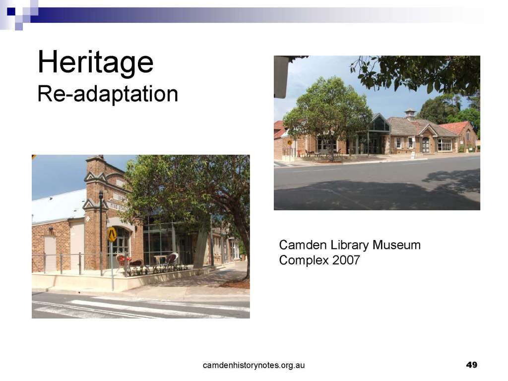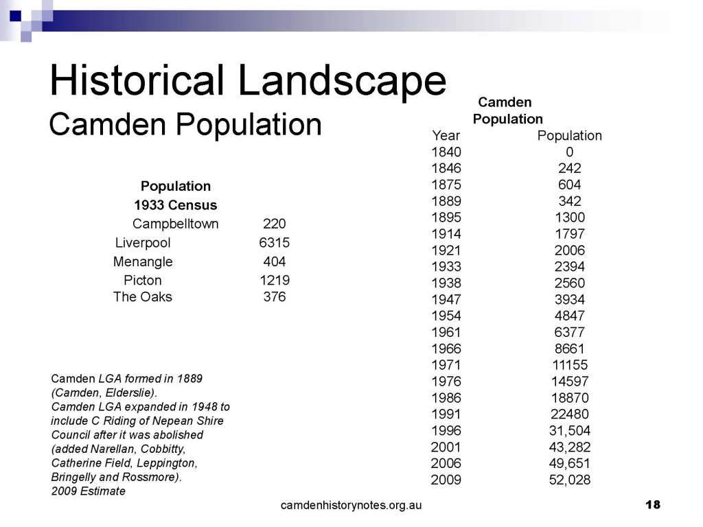 This presentation examines Sydney’s urban expansion into the local area (in Elderslie, Oran Park, South Camden), which threatens to destroy what is left of Camden’s notion of being a country town. Fact or fiction? Many in the local community desire to retain Camden’s image as a country town. Is this just a dream, or is there some reality to this idea? Many local people talk about retaining Camden’s ‘country town atmosphere’ or ‘keeping Camden country’. The town is described as ‘picturesque’ and having ‘charming cottages’. To others, Camden is a ‘working country town’ or ‘my country town’. These values and ideas are connected to the reality of trying to keep what is left of Camden as a country town. Tourist brochures use these ideas to picture idyllic rural scenes. Land developers have scenes of families frolicking in the meadows with their children. These values and ideas are based on nostalgia. They look back to the early days of Camden, when daily life in the town was uncomplicated, innocent, and genuine, with traditional rural values. When people talked to their neighbours and stopped for a chat in the street, they were based on nostalgia. Nostalgia and yearning for a lost past have been re-created in a ‘country town idyll’ in Camden, NSW today.