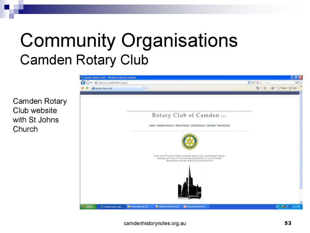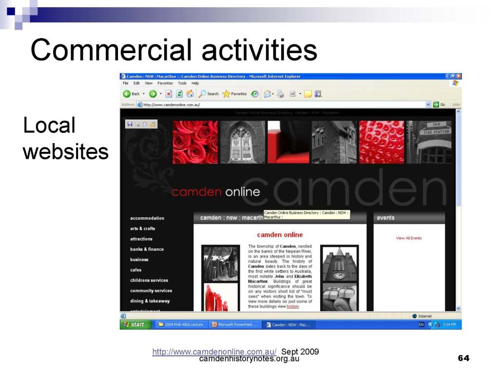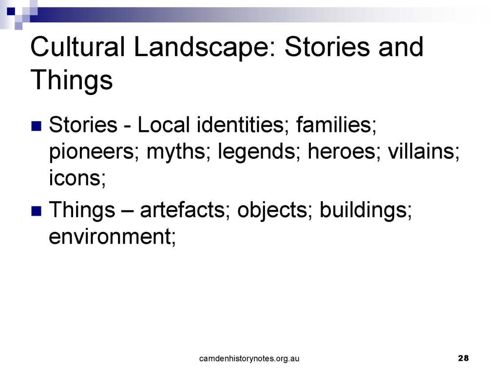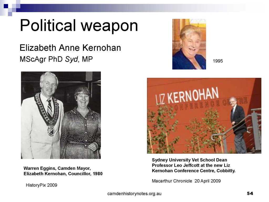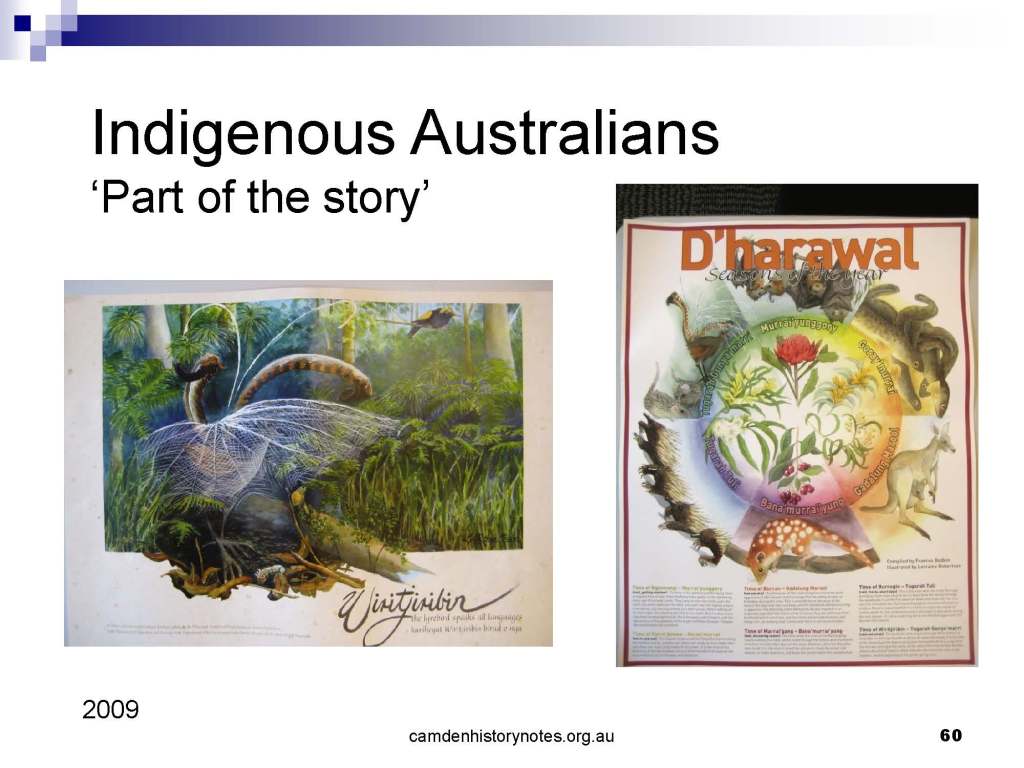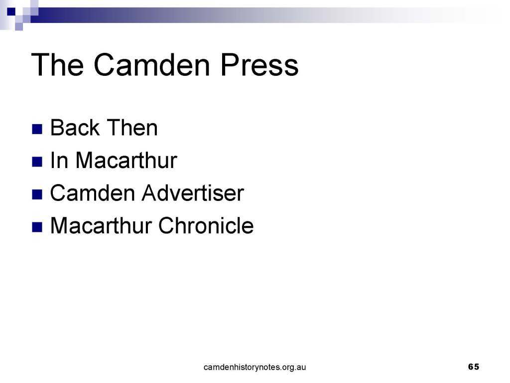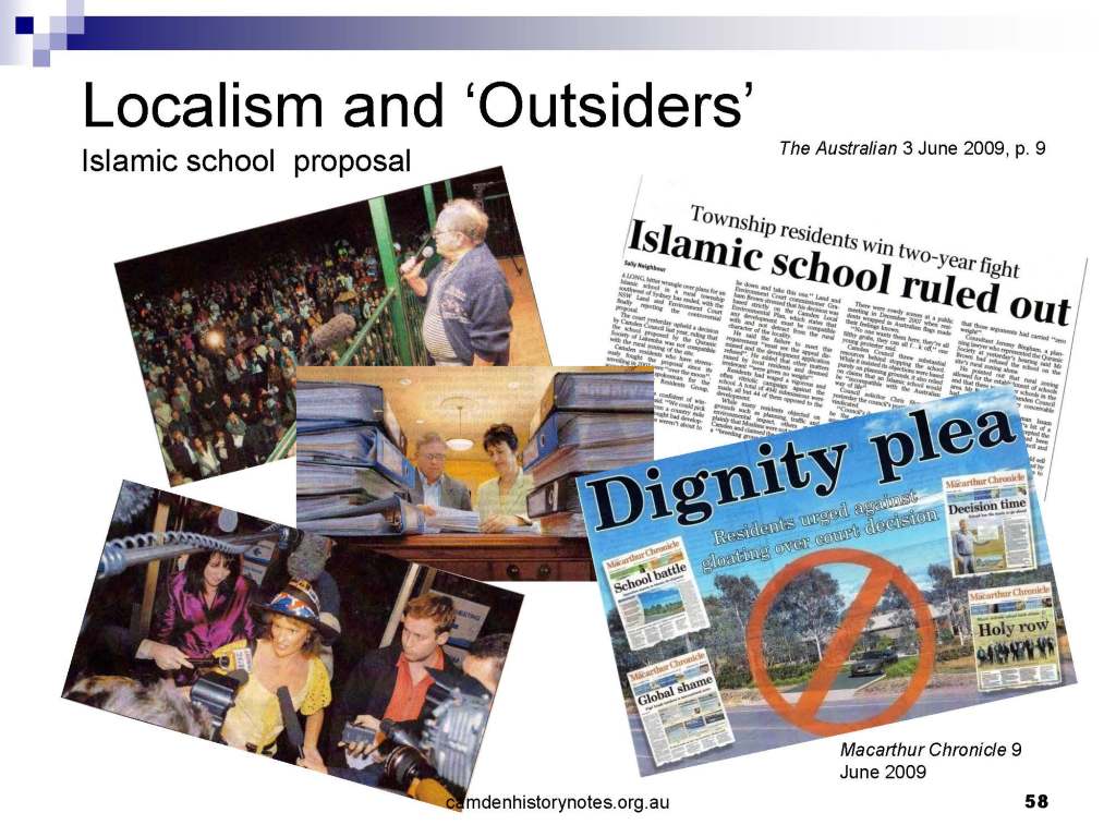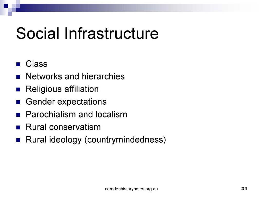 This presentation examines Sydney’s urban expansion into the local area (in Elderslie, Oran Park, South Camden), which threatens to destroy what is left of Camden’s notion of being a country town. Fact or fiction? Many in the local community desire to retain Camden’s image as a country town. Is this just a dream, or is there some reality to this idea? Many local people talk about retaining Camden’s ‘country town atmosphere’ or ‘keeping Camden country’. The town is described as ‘picturesque’ and having ‘charming cottages’. To others, Camden is a ‘working country town’ or ‘my country town’. These values and ideas are connected to the reality of trying to keep what is left of Camden as a country town. Tourist brochures use these ideas to picture idyllic rural scenes. Land developers have scenes of families frolicking in the meadows with their children. These values and ideas are based on nostalgia. They look back to the early days of Camden, when daily life in the town was uncomplicated, innocent, and genuine, with traditional rural values. When people talked to their neighbours and stopped for a chat in the street, they were based on nostalgia. Nostalgia and yearning for a lost past have been re-created in a ‘country town idyll’ in Camden, NSW today.