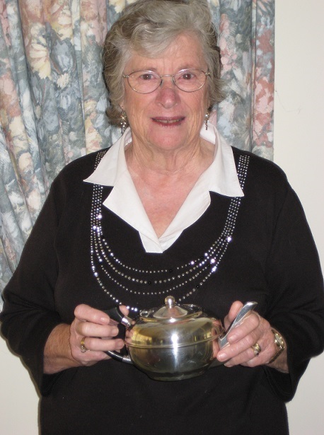 I thought I had better go when I got pregnant. Alan [Alma’s husband] said that Mrs Frazer was concerned she would slip in the kitchen or have an accident as Alma was so heavy (pregnant). Mrs Frazer was concerned about her insurance position. The Frazers gave me a silver teapot when I left in 1975 [photo].