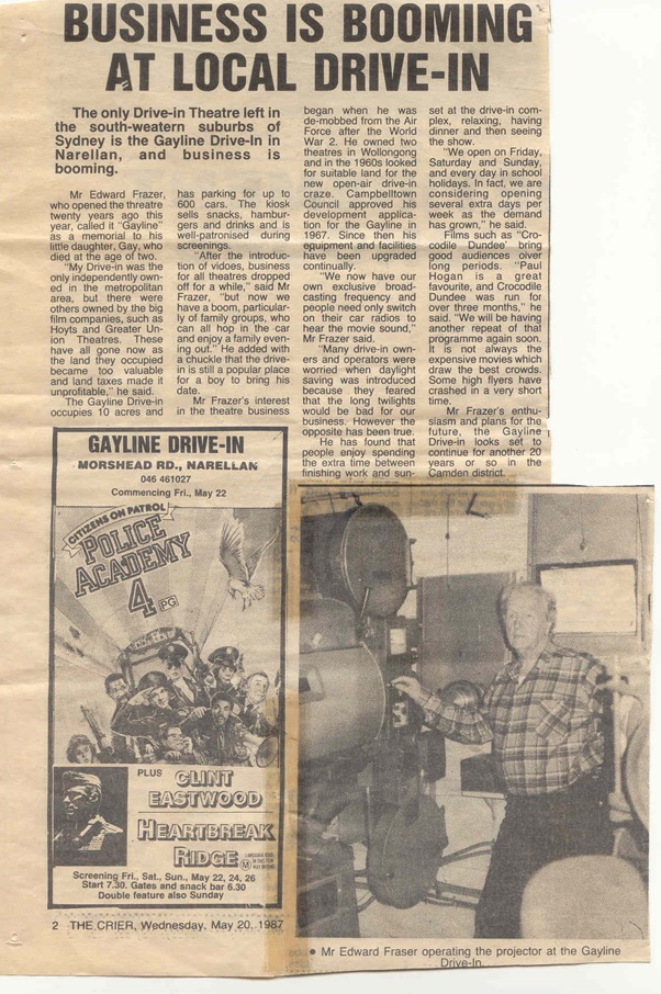 Ted Frazer, the owner/operator of the Gayline Drive-In, was a picture showman. The Frazers had cinemas on the South Coast, at Scarborough and Lake Illawarra. At Scarborough, they operated the Gala Movie Theatre. It was established in 1950 and had sessions on Wednesday, Friday, Saturday nights and Saturday matinees. The family ran movies in the local progress hall at Lake Illawarra.