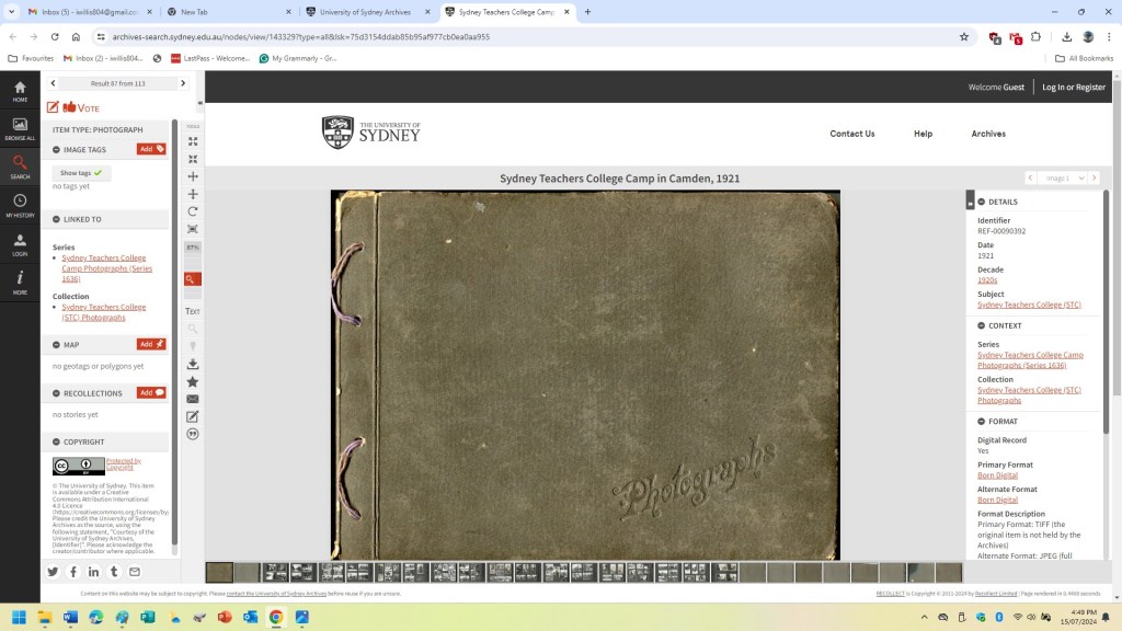 Her enrolment at Sydney Teachers College made her part of the socially upwardly mobile of her generation. She was a modern girl and owned a Kodak Box Brownie camera, introduced to Australia in 1910, which she used to record her time at the Camden camp. (Peter Mills, Email 19 July 2024)