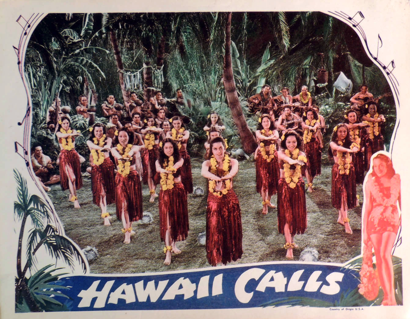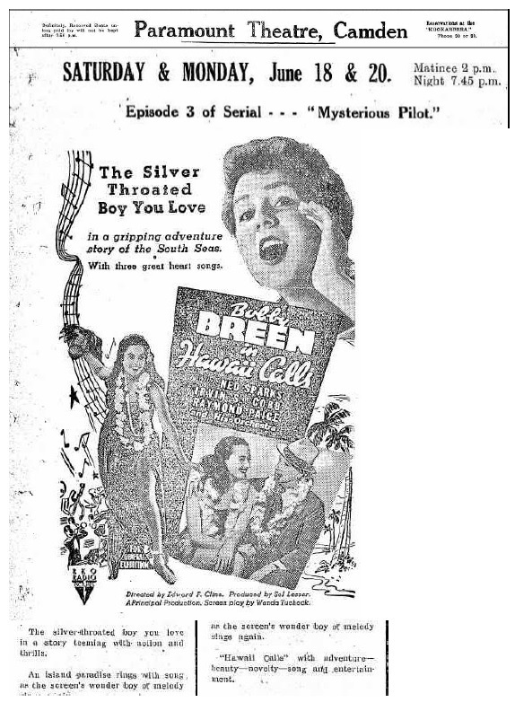 In the late 1930s, film promoters used less paternalistic language in advertising. The 1938 Camden’s Paramount Movie Theatre screened RKO Radio Pictures ‘Hawaii Calls’, and the advertising stated that the story of an ‘island paradise [that] rings with song’ is full of ‘adventure, beauty, novelty, song and entertainment’. (Camden News, 16 June 1938) The following year, Paramount screened MGM’s ‘Honolulu’, a movie that promised to ‘call you’ to Hawaii with ‘the sweat heart of musical hits!’ ‘It’s star-packed, song-filled, laugh-jammed . . . .the romantic colossus of spectacle . .with hundreds of hip-swinging hula honeys!’ (Camden News, 6 July 1939)