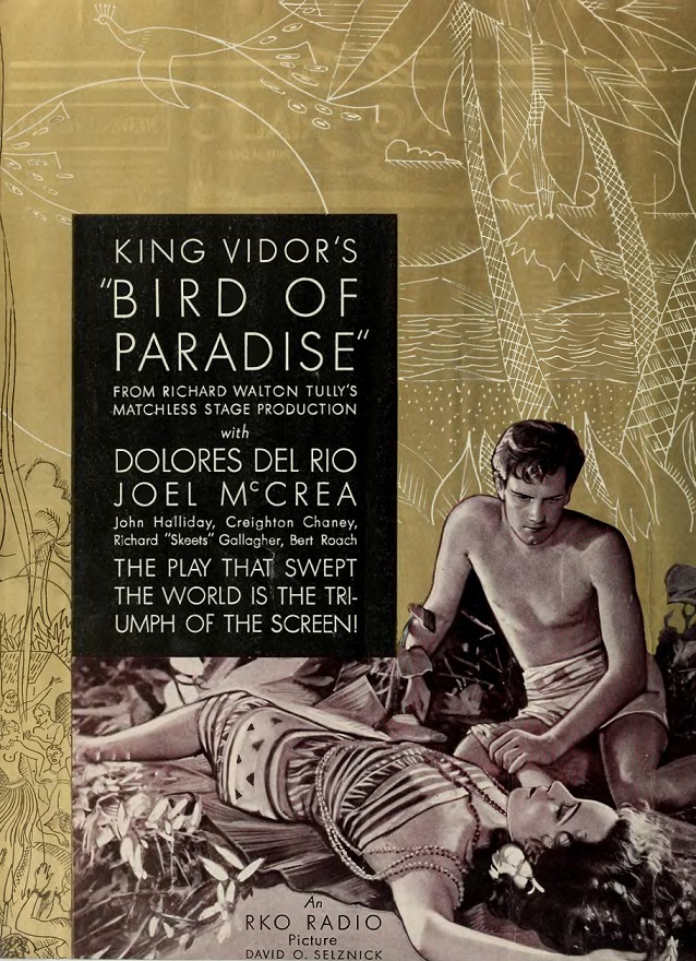 At Campbelltown’s Macquarie Cinema in 1933, the RKO-Radio Pictures ‘Bird of Paradise’, filmed in the ‘authentic background’ of the Hawaiian Islands, showed the ‘breathtaking’ beauty of the islands. The film, a romantic adventure drama, depicted the love of the hero and ‘white man’, Johnny Baker, with the ‘primitive, trusting Luana’ who ‘hopelessly sacrifices’ her love in a ‘sublime’ setting. The Hawaiian hula was described as ‘the barbaric beauties of the primitive Hawaiian mating dance were caught in all their splendour’. (Campbelltown News, 27 October 1933) Wikipedia states that the director King Vidor presented ‘this “tragic” romance as a clash between modern “civilisation” and a sexual idyll enjoyed by Rousseauian-like Noble savages’. In the early 1930s, Hollywood produced several films that connected former Pacific colonies with widespread interest in “exotic” tropical locations. (Wikipedia)