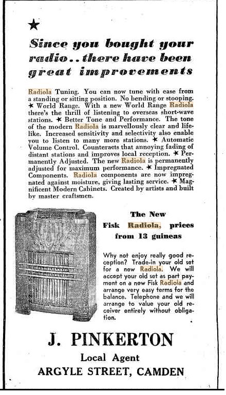 In 1938, Camden residents could purchase a Radiola wireless set from James Pinkerton at 59-61 Argyle Street, where he ran a tailor shop. Prices for the latest Fisk Radiola started at 13 guineas, a princely sum in 1938 when the average weekly wage for a factory worker was just under £5. Built by ‘master craftsmen’ and allowed Camden listeners to tune into global short-wave broadcasts with ‘better tone and performance’. (Camden News, 22 December 1938)