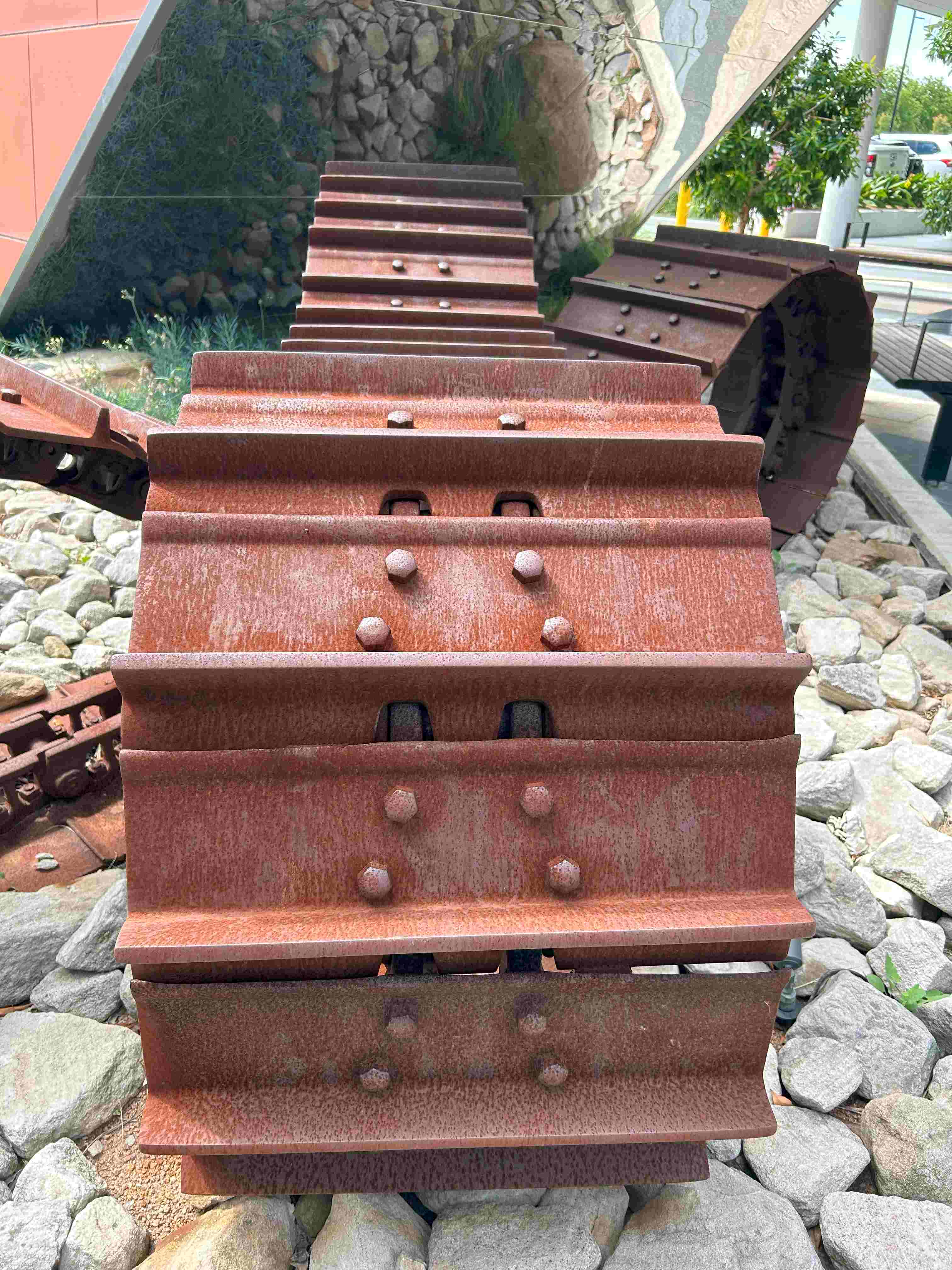 The reflective surface of the stainless steel provides an interesting mirror to the artwork, maybe acting as a metaphor for the harsh, heavy steel tracks in the work and the modernist aesthetic provided by the surrounding glass and aluminium.