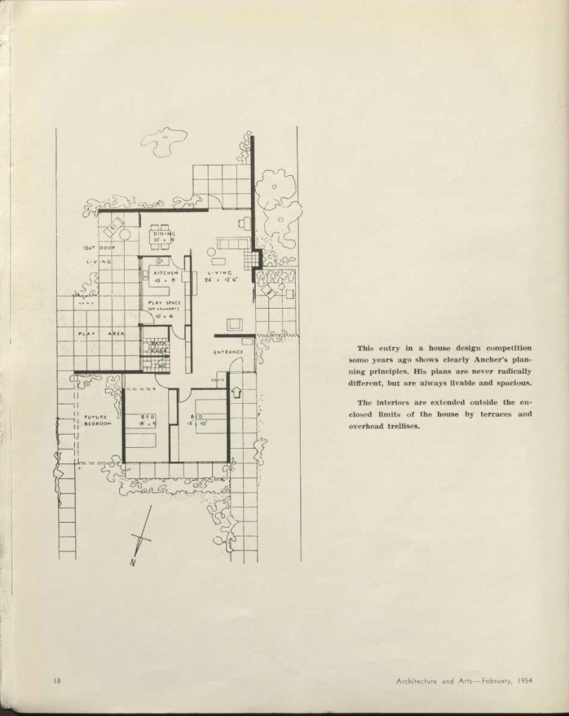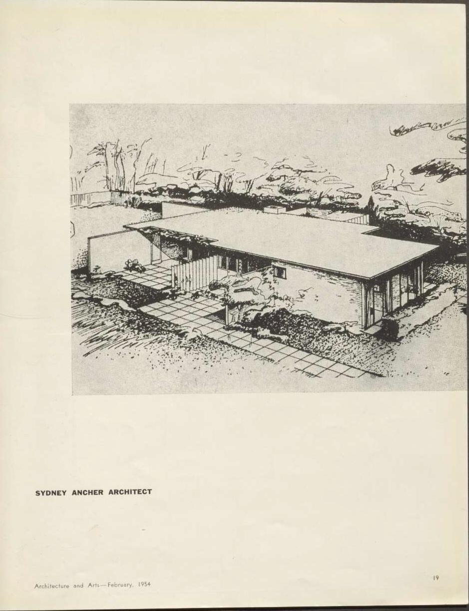 One example from the first edition of Architecture and Arts undoubtedly would have influenced the design in the Camden area in the 1950s. The magazine profiled Sydney architect Sydney Anchor, who created what is known as the Canberra House. He was influential in the design of Australian domestic housing in the 1950s and 1960s. His influence can be identified in a number of the houses around the Camden district that were built at this time. It was similar to the design below.