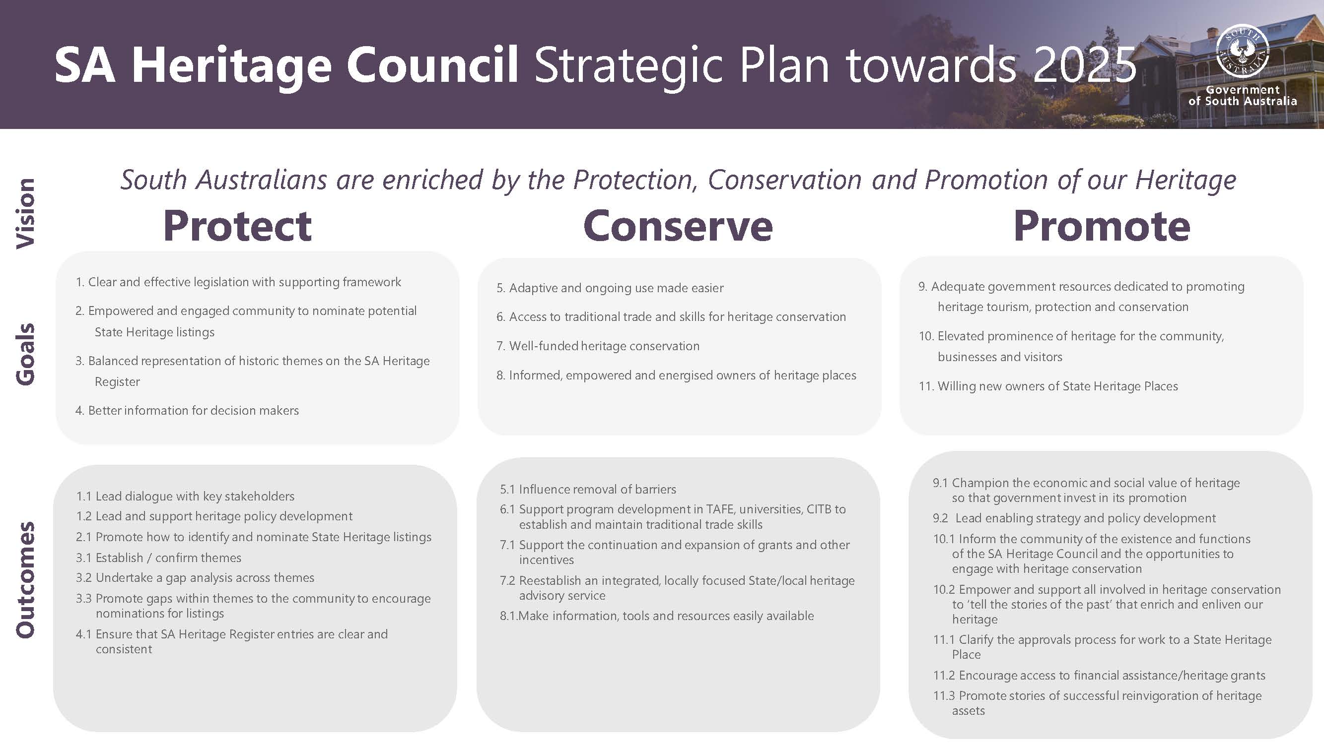 The South Australian Government has a strategic plan, which it has applied to heritage tourism and called Growing Our Future Heritage.