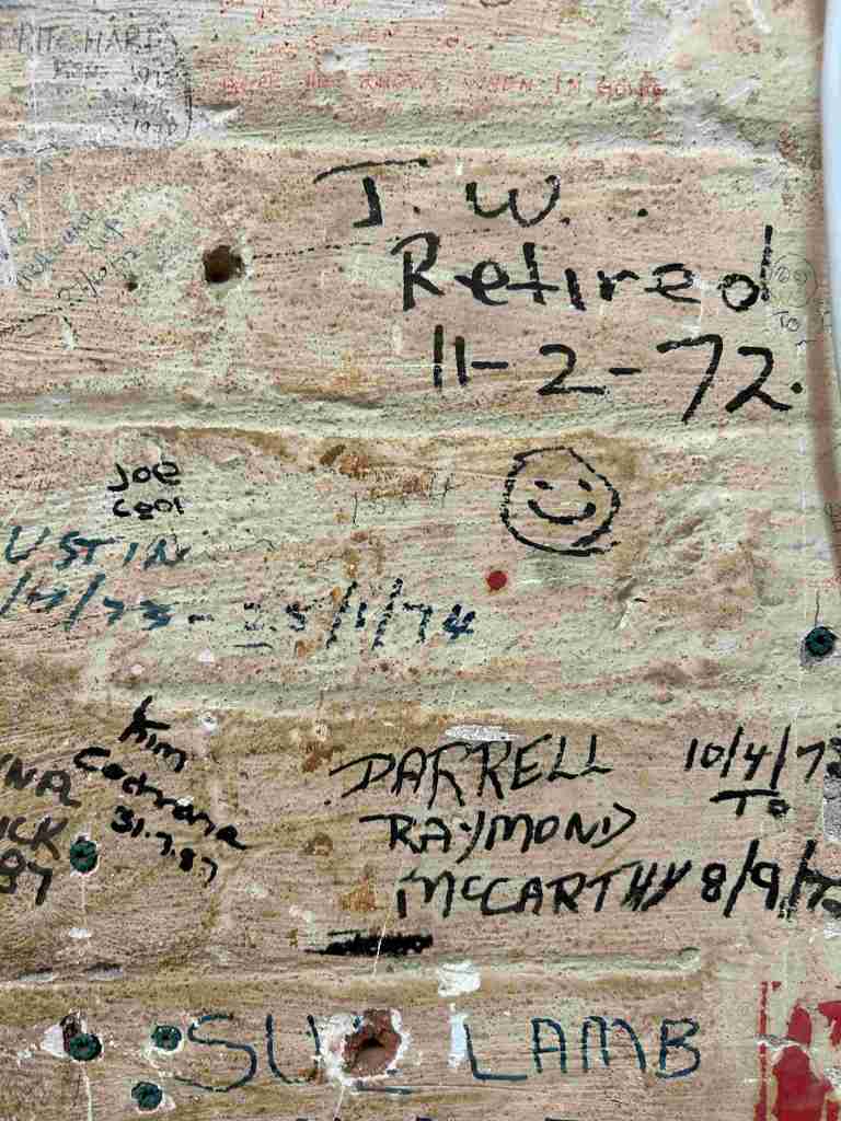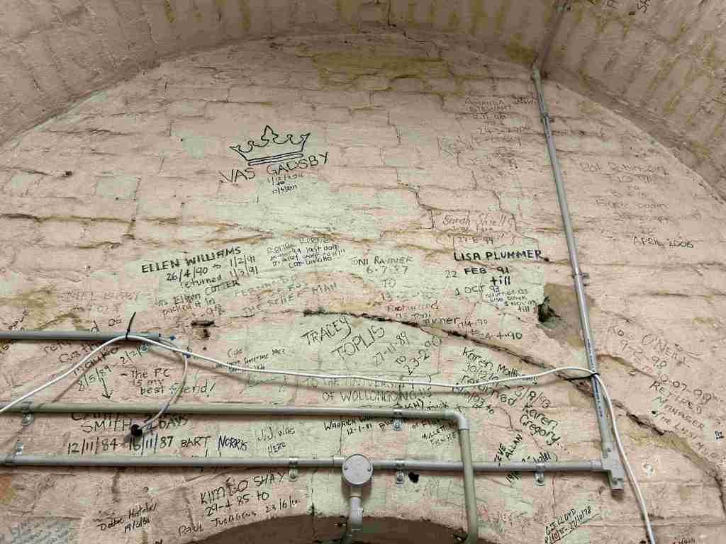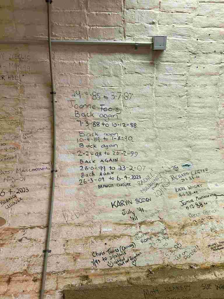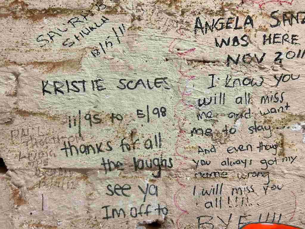 The signatures are a form of storytelling. If these walls could talk, they would tell quite a story about those whose names are written on them. This is a historic record of former bank workers.