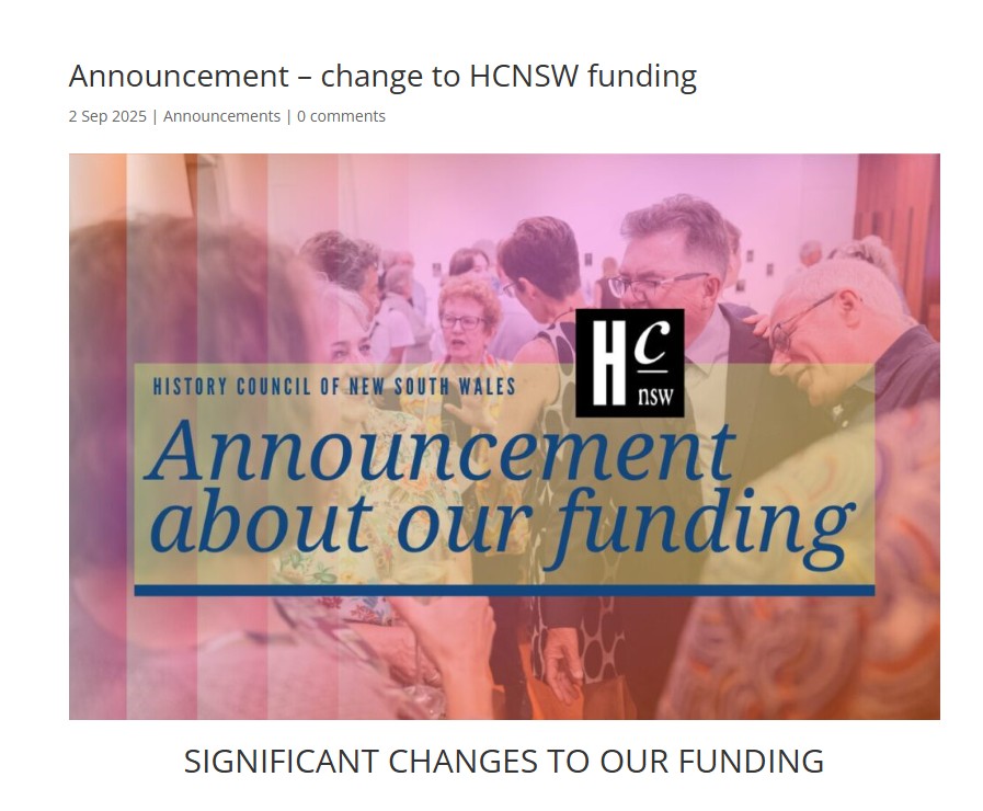 Shirley, C. (2025). Announcement – change to HCNSW funding. [online] History Council of New South Wales. Available at: https://historycouncilnsw.org.au/change-to-hcnsw-funding/?fbclid=IwY2xjawM5nTpleHRuA2FlbQIxMABicmlkETFMcTZhYk1sRFBIbXRTSXJHAR5xmdcRGSGDlKTV48qy2m93ICFFWz4tr27yWdbquAMemaHf5kKpO3nw_8gxqg_aem_Bfe5A664ZWdMCqm2-dziPQ [Accessed 19 Sep. 2025].