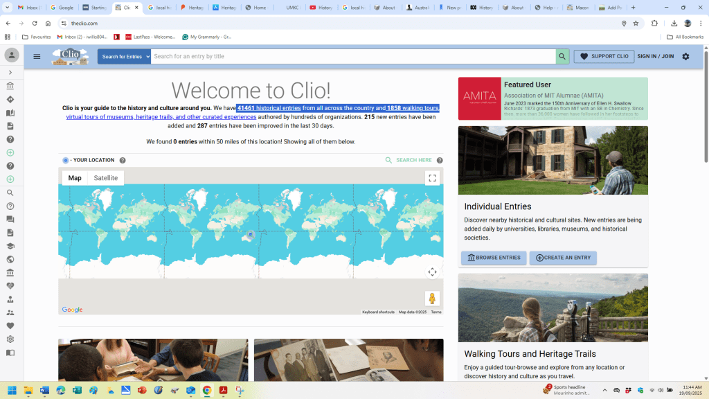 Clio is a free website supported by donations from supporters. The website has 41461 historical entries from all across the country and 1858 walking tours, virtual tours of museums, heritage trails, and other curated experiences authored by hundreds of organizations. (Clio. (2025).