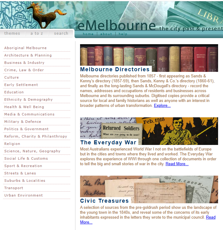 Some examples of these fragmented sites include NLA Trove, SLNSW Dictionary of Sydney, specific regional apps like Heritage of Western Sydney, the Encyclopedia of Melbourne, websites of local historical societies and blogs, walking tours and art trails, amongst others.