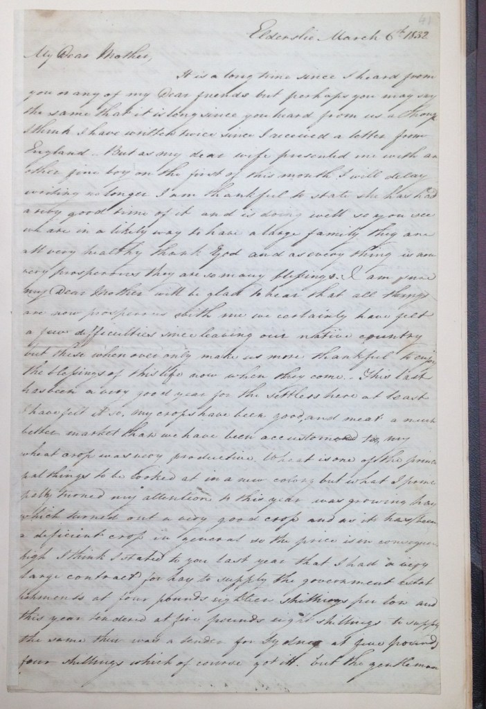 you will observe by the date of this letter that Elderslie is still the place of our residence my Farm had done Extremely well for the last two years I found growing grain so very uncertain in this climate that I fortunately turned my attention to growing hay which I have found much more profitable & more since I have been as fortunate as to have the Government contracts the last two years for hay last year at four pounds Eighteen shillings per Ton and this year at six pounds fourteen shillings per Ton They take upwards of five Tons a which Takes some carting forty miles.