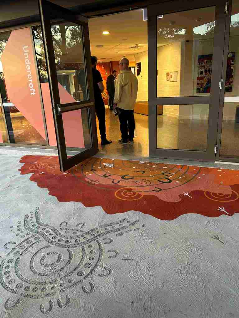 a hand-painted mural by Dharawal artist, Michael Fardon; a hand-painted mural by founders of Dalmarri Art, Trevor Eastwood and Jason Douglas; sculptural seating art by Abbey Michelle Rich; a stainless steel sculpture entitled The Eternal Flame by Odilon Barraquio; and an incredible light box exhibition space, the inaugural exhibition featuring the work of Camden artist Jane Wray. (Camden Council 2025)