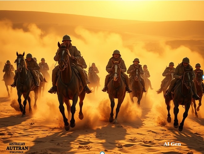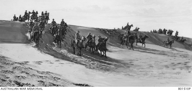 near Esdud in Palestine, shows men of the 1st Australian Light Horse Brigade riding over the sandhills. (Hutchings 2026)