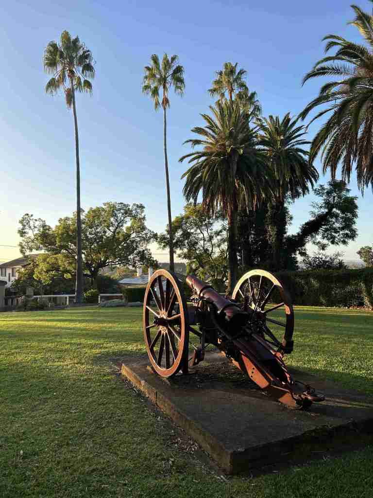 Located in the southeastern corner of Camden’s Macarthur Park, on top of the ridge line on the highest point in the town centre, is the town’s World War One Anzac precinct made up of the cenotaph, the memorial lychgate, and three war trophy guns, surrounded by Mediterranean palms.