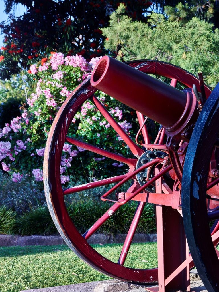 The war trophy guns surrounding the Camden cenotaph create a strange juxtaposition and an ironic effect. The battlefield instruments of death surround a memorial to soldiers who died on the battlefield.