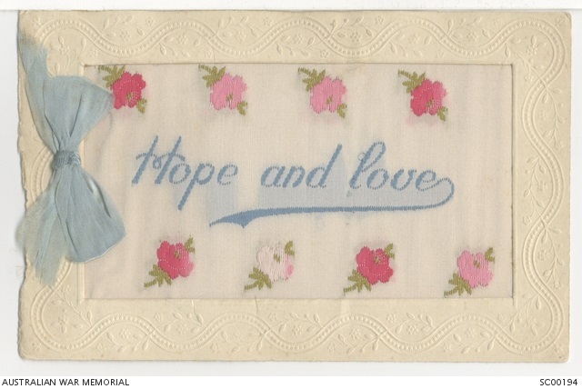 A postcard from Frederick for sister Millie During the First World War, local soldier Frederick Kelloway sent his sister, Millie, an embroidered silk postcard to celebrate Christmas and New Year at home in 1916. The front of the embroidered silk postcard that Frederick Kelloway sent his sister Millie in 1916. (KCordina 2023) Millie’s great-granddaughter Kellee… Continue reading An embroidered silk postcard for Millie at Christmas 1916
