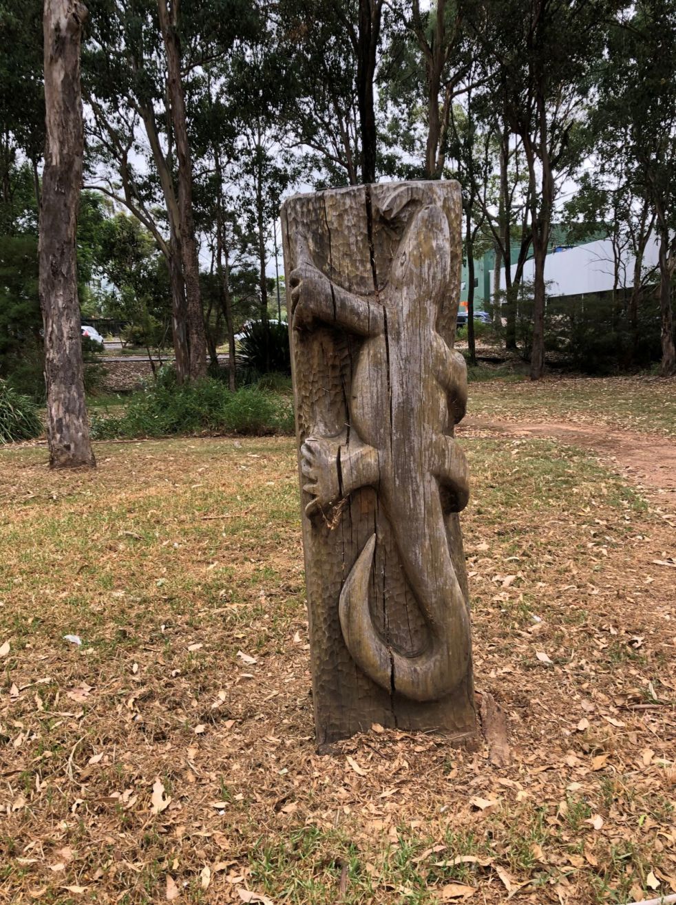 In Elyard Reserve Narellan NSW there is representation of a goanna climbing a pole. A local public artwork.